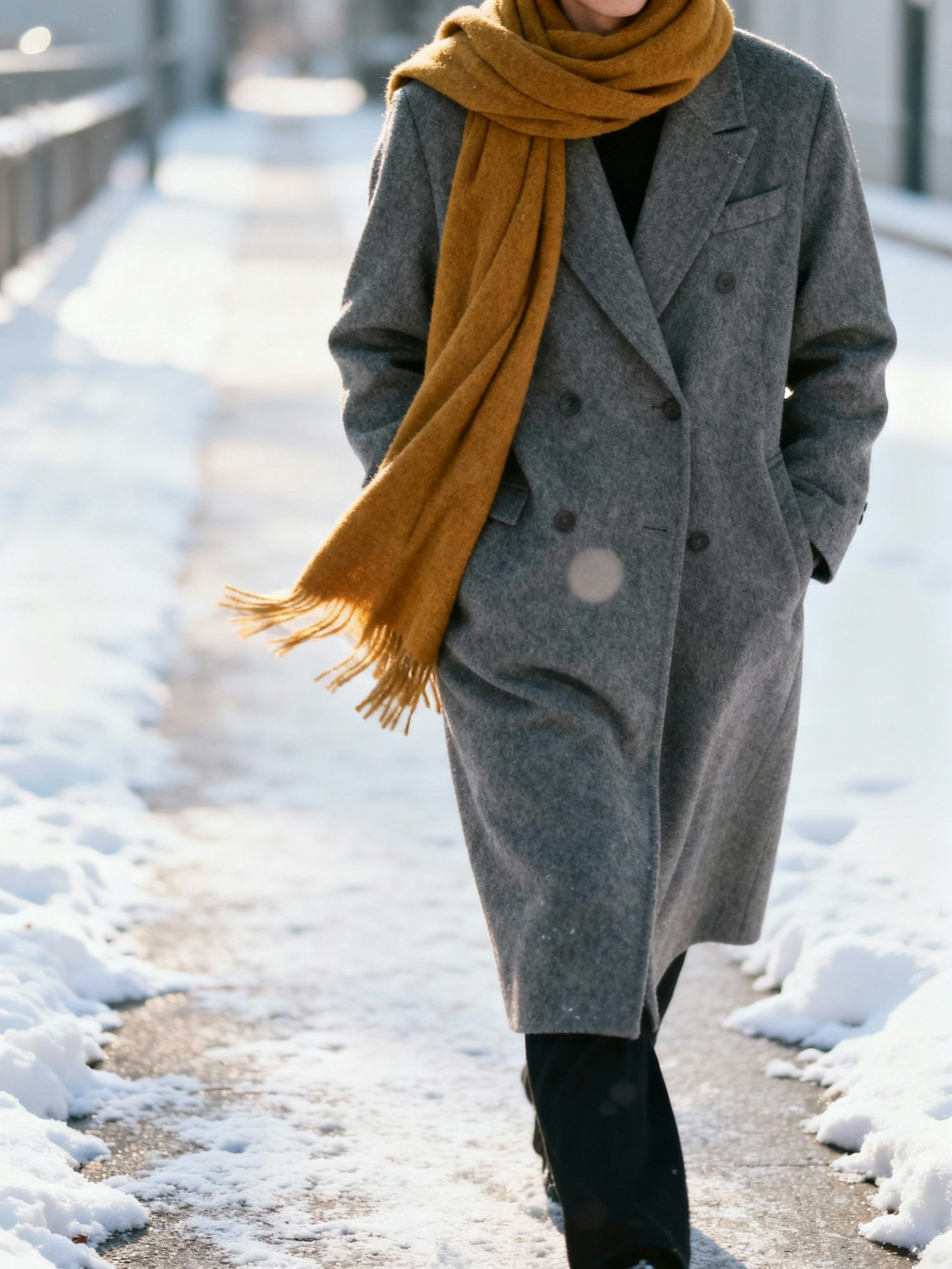 Winter lifestyle photo with natural sunlight, subtle motion, and shallow depth of field. A person walking slowly along a snowy pathway wearing a grey wool coat and a thick amber-gold scarf wrapped loosely around the neck. Scarf moves lightly with the step, clean urban blur in background. Negative: bright yellow, orange neon, stylized warmth.
