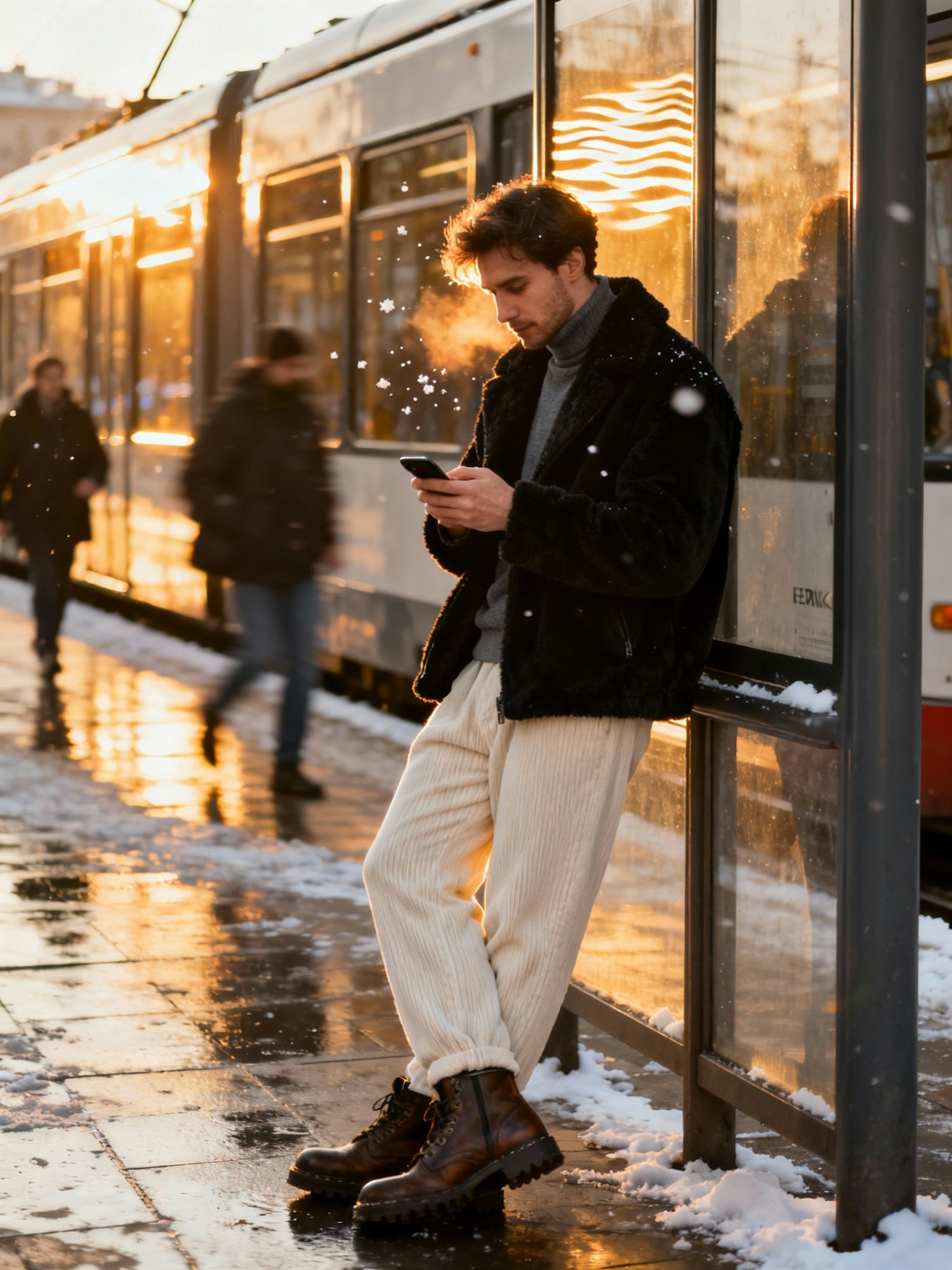 A realistic street-photography fashion image captured in Sofia, winter 2026, golden hour. Taken with a 35 mm lens at f / 2.4 and 1 / 800 shutter speed from eye level, the photo catches a candid moment of a young man in his late twenties leaning against a tram stop near Serdika, absorbed in his phone as the setting sun paints the scene in amber tones. His outfit blends modern streetwear with quiet sophistication: an oversized black shearling jacket over a slate turtleneck, relaxed cream corduroy pants, and chunky leather boots. The light flares softly across his face, highlighting a few drifting snowflakes in the air. Reflections from tram windows ripple warm light over the wet pavement, while pedestrians pass in blurred motion. The image feels unposed and cinematic, as though caught between thoughts. The mood is introspective, glowing with Sofia’s understated winter style.