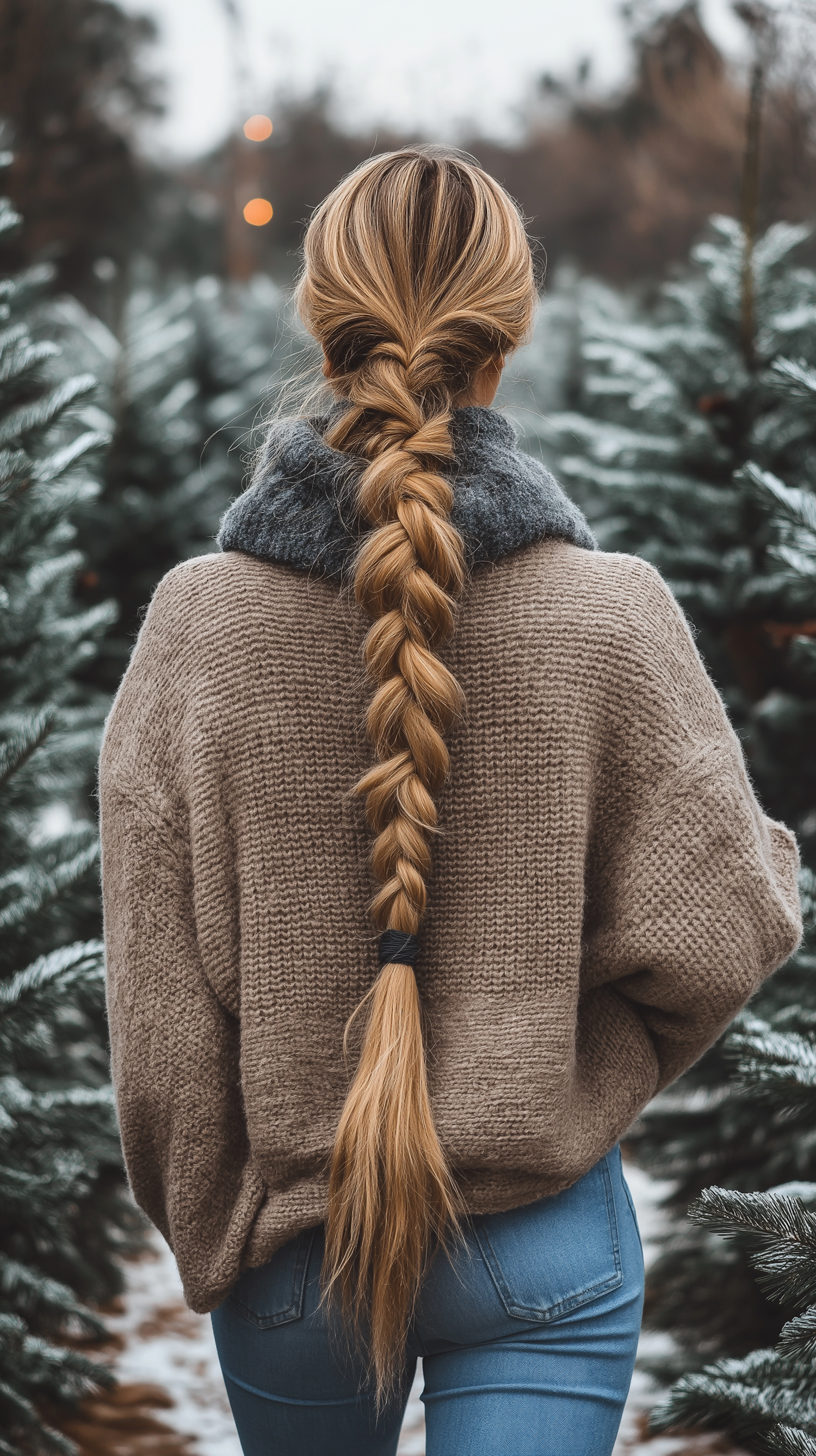 Woman with long braided hair in a cozy sweater stands among snowy evergreens, capturing a serene winter scene.