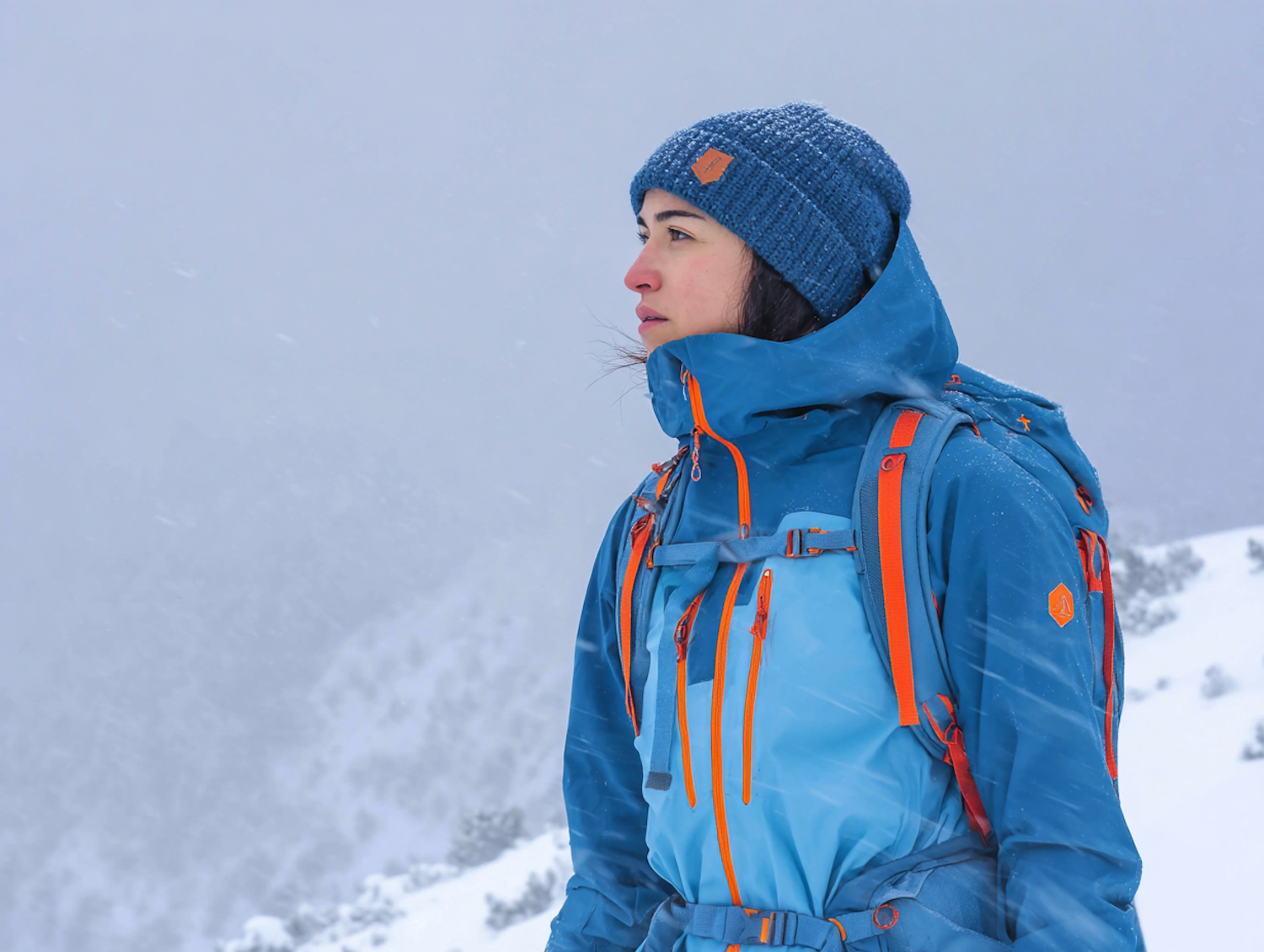 A hiker dressed in blue with orange accents stands amidst a snowy landscape, their breath visible in the cold air.