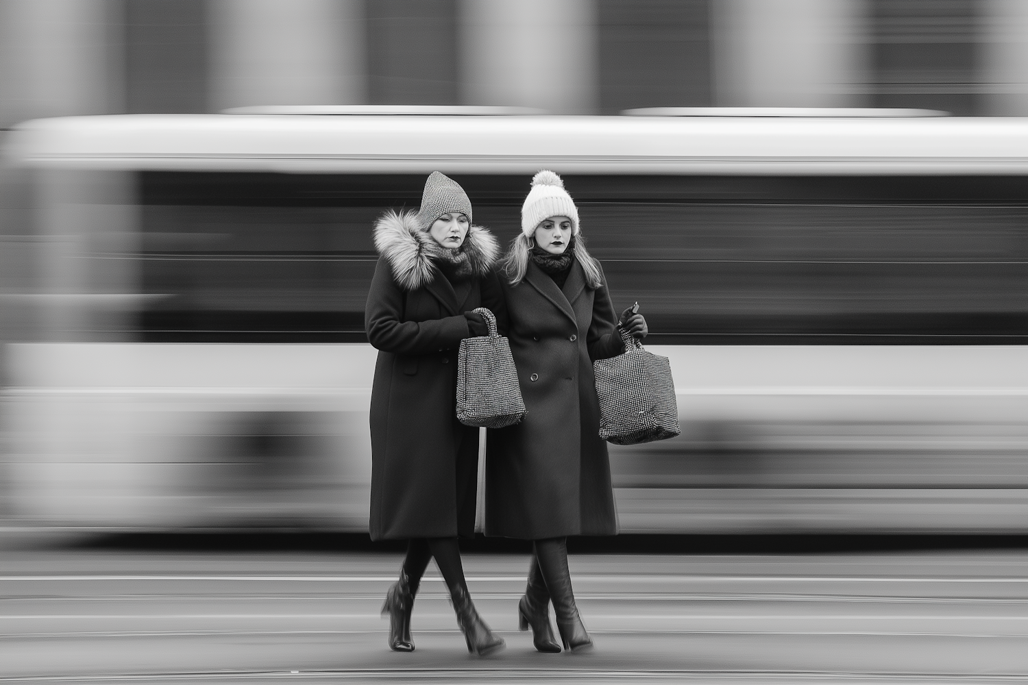 Two women in winter coats and hats walk with handbags against a blurred bus background, creating a dynamic monochrome scene.