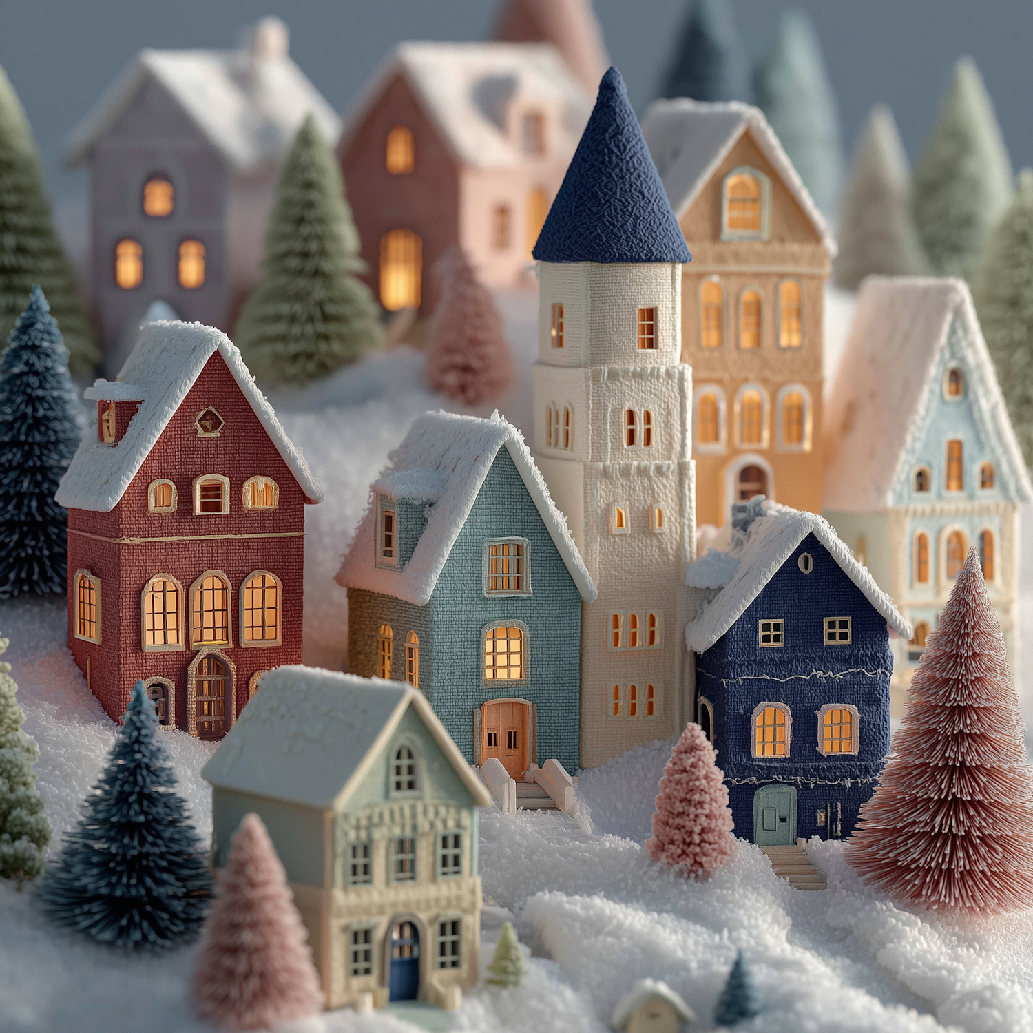 A cozy winter village with pastel houses, snow-covered roofs, and glowing windows, surrounded by snow-dusted trees in a serene setting.