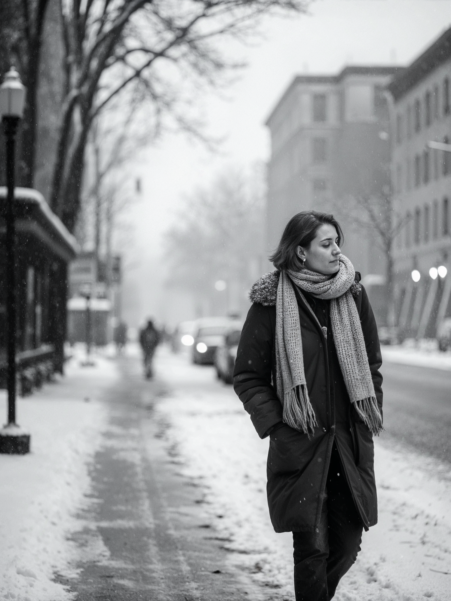 Woman walking in a snowy city street, wearing a winter coat and scarf, in a serene black and white scene.