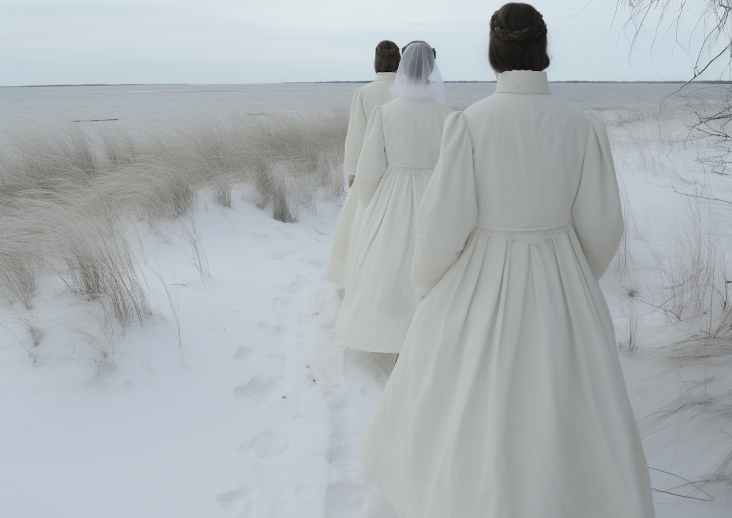 Three women in white coats walk along a snowy path by the sea, with one wearing a veil. A serene, wintry landscape surrounds them.