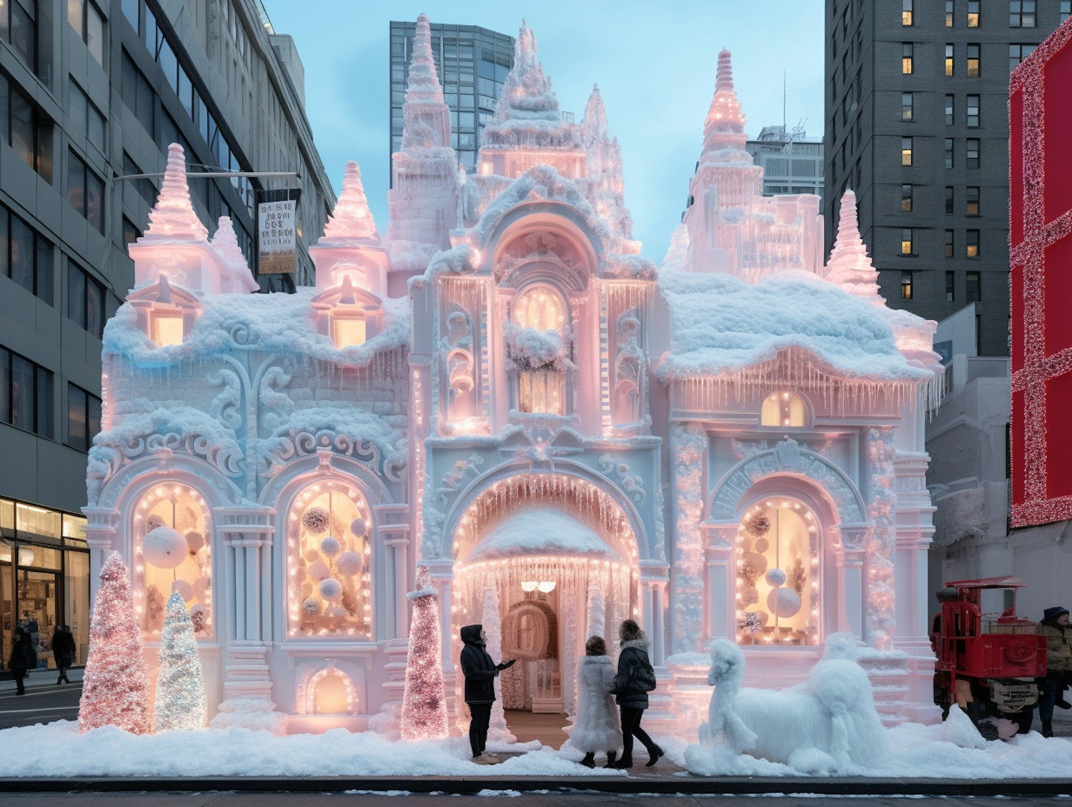 A magical snow-covered palace with pink lighting, intricate details, and icy sculptures in a bustling urban winter setting.