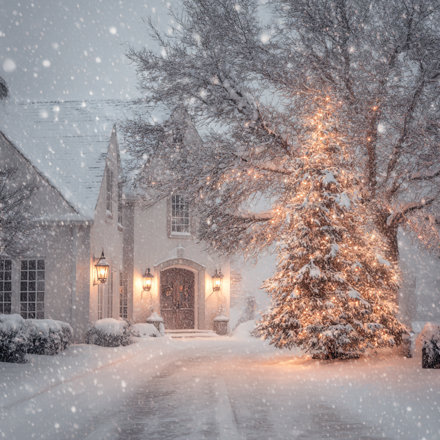 A cozy snow-covered house with glowing lights and a decorated tree, creating a serene and festive winter atmosphere.
