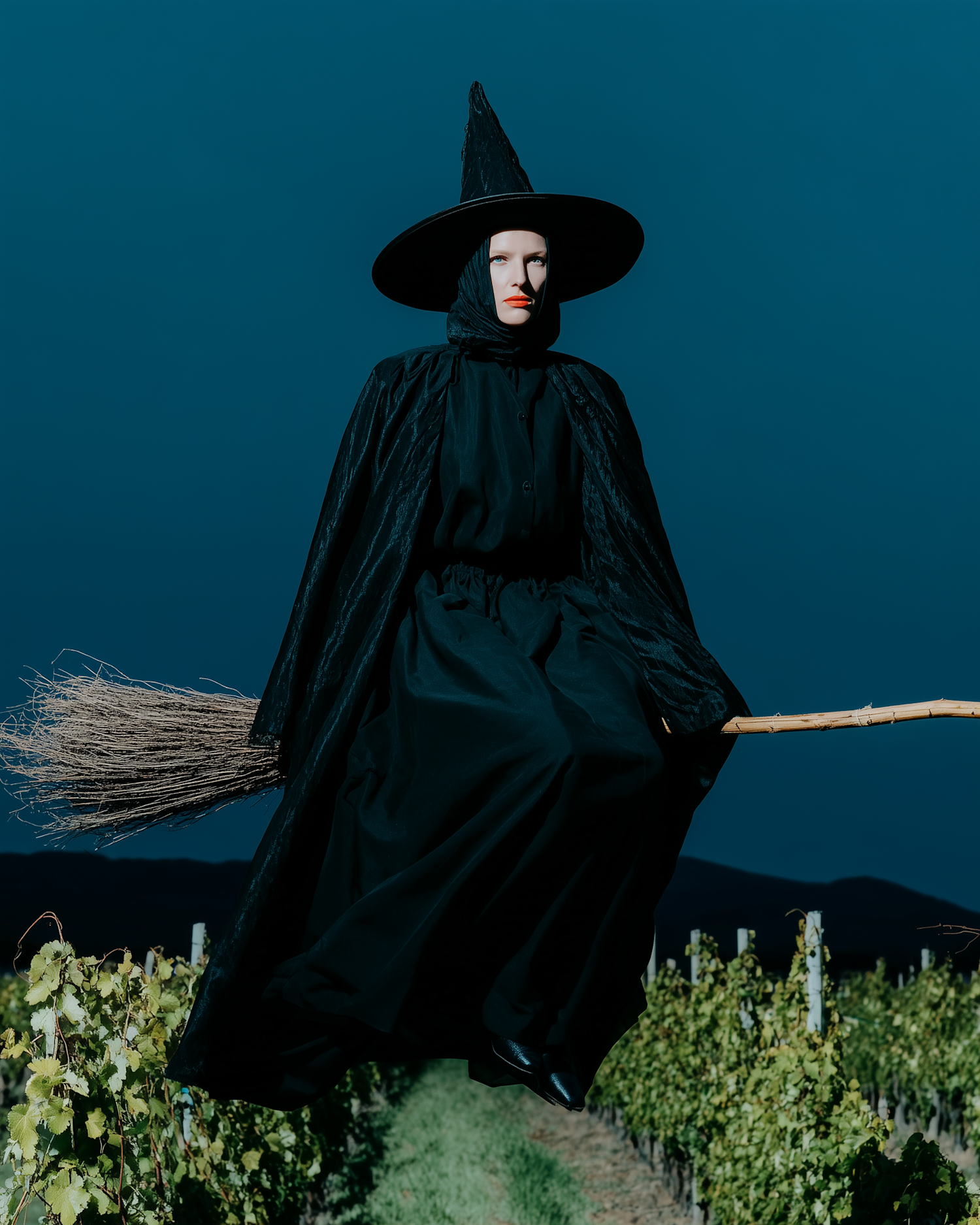 A witch in a black outfit flying on a broomstick over a vineyard under a dark blue sky, creating a mystical and eerie scene.