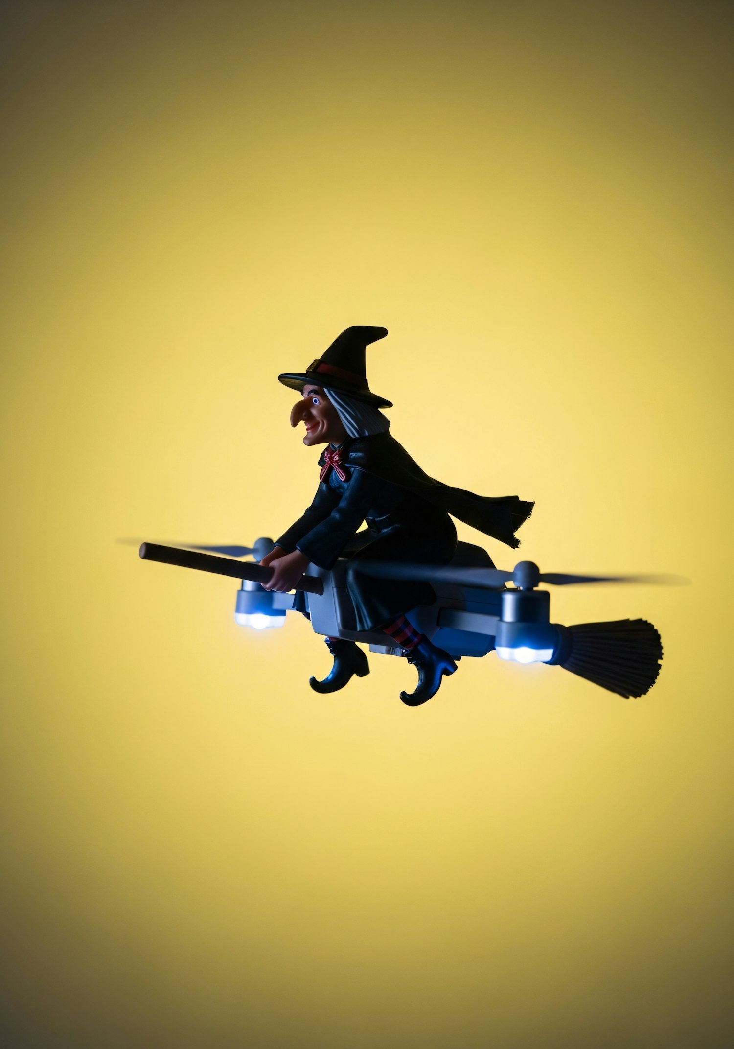 A playful figurine of a witch riding a drone-broomstick against a yellow background, blending traditional and modern elements.