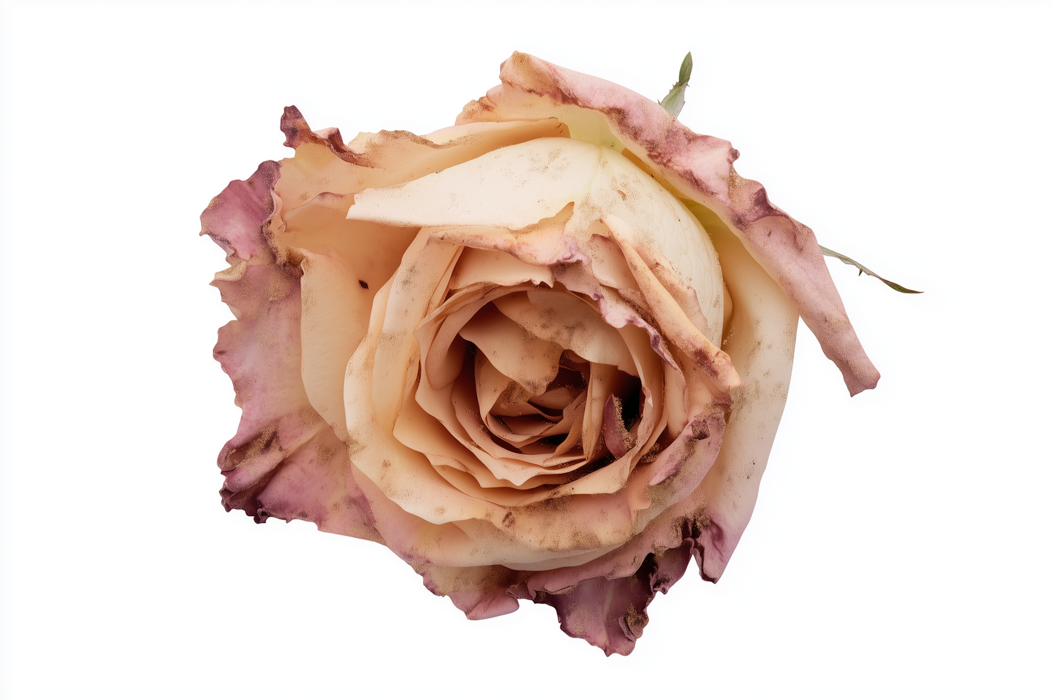 Close-up of a withered beige rose with pink and brown edges, showcasing its aged, curled petals against a clean white background.