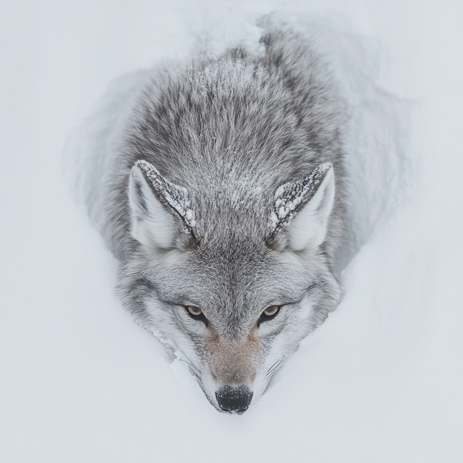 A gray wolf lies in the snow, its intense amber eyes and snow-dusted fur creating a striking winter scene.