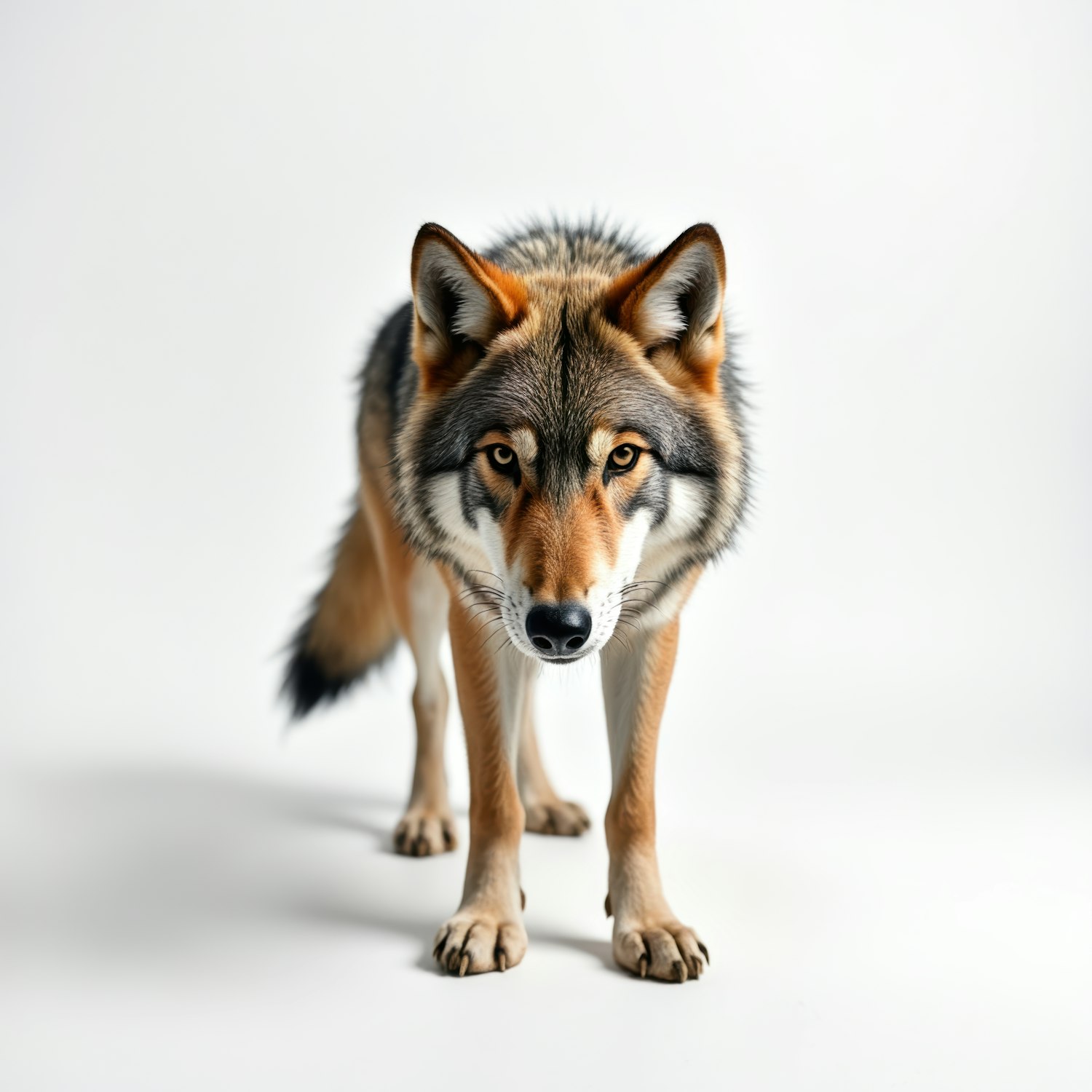 Majestic wolf with piercing yellow eyes and striking fur pattern stands confidently against a plain white background.