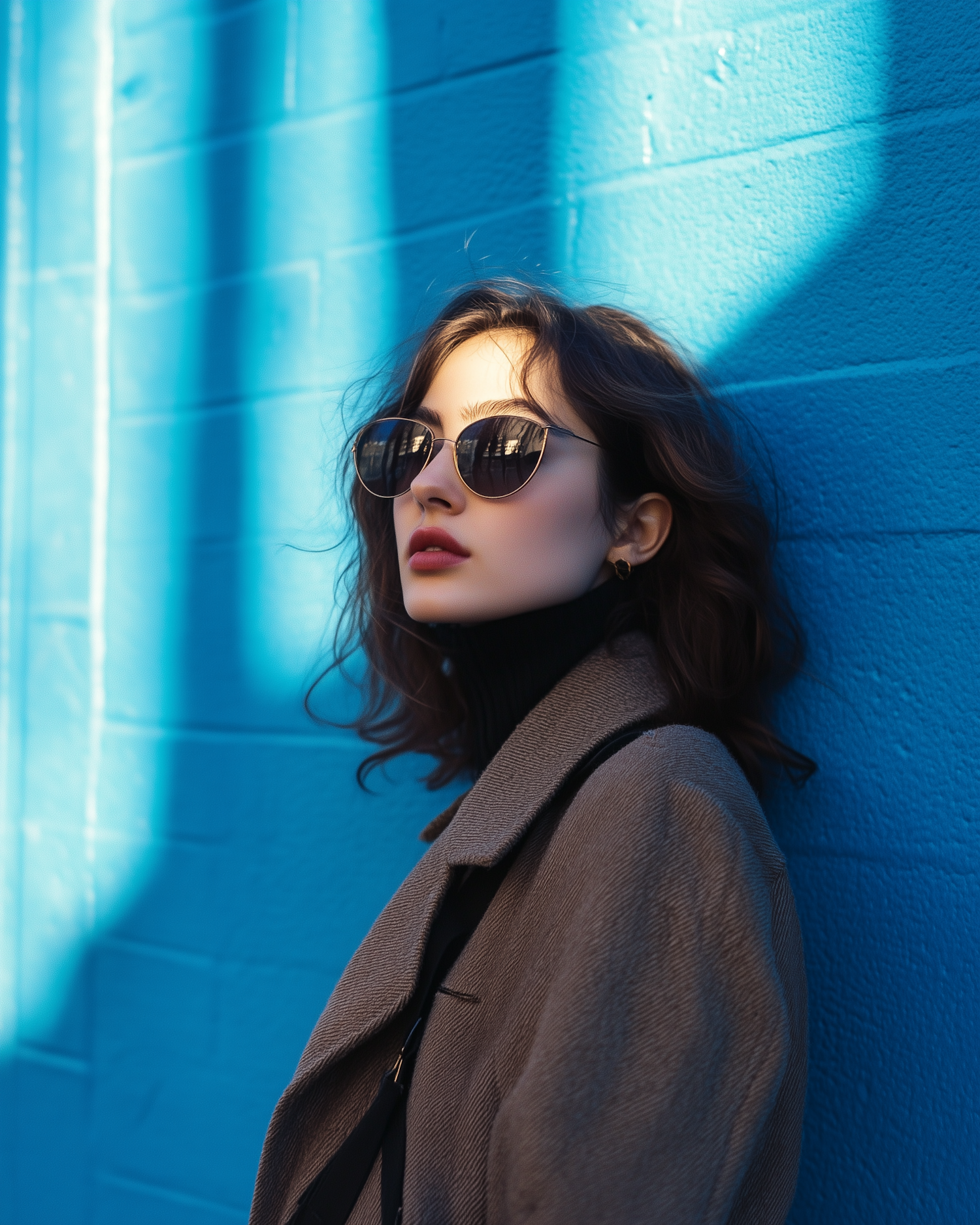Stylish woman in sunglasses and gray coat against a vibrant blue wall, with dramatic sunlight and shadows enhancing the urban vibe.
