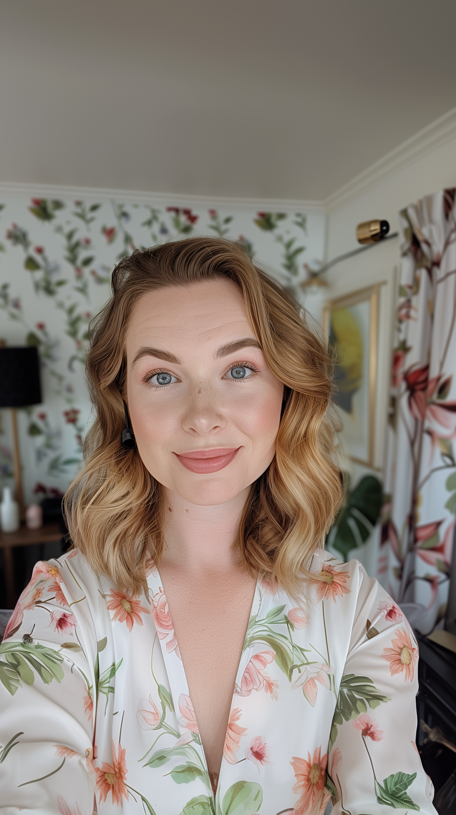Smiling woman with blonde wavy hair in a floral blouse, set against a room with floral wallpaper and soft natural lighting.