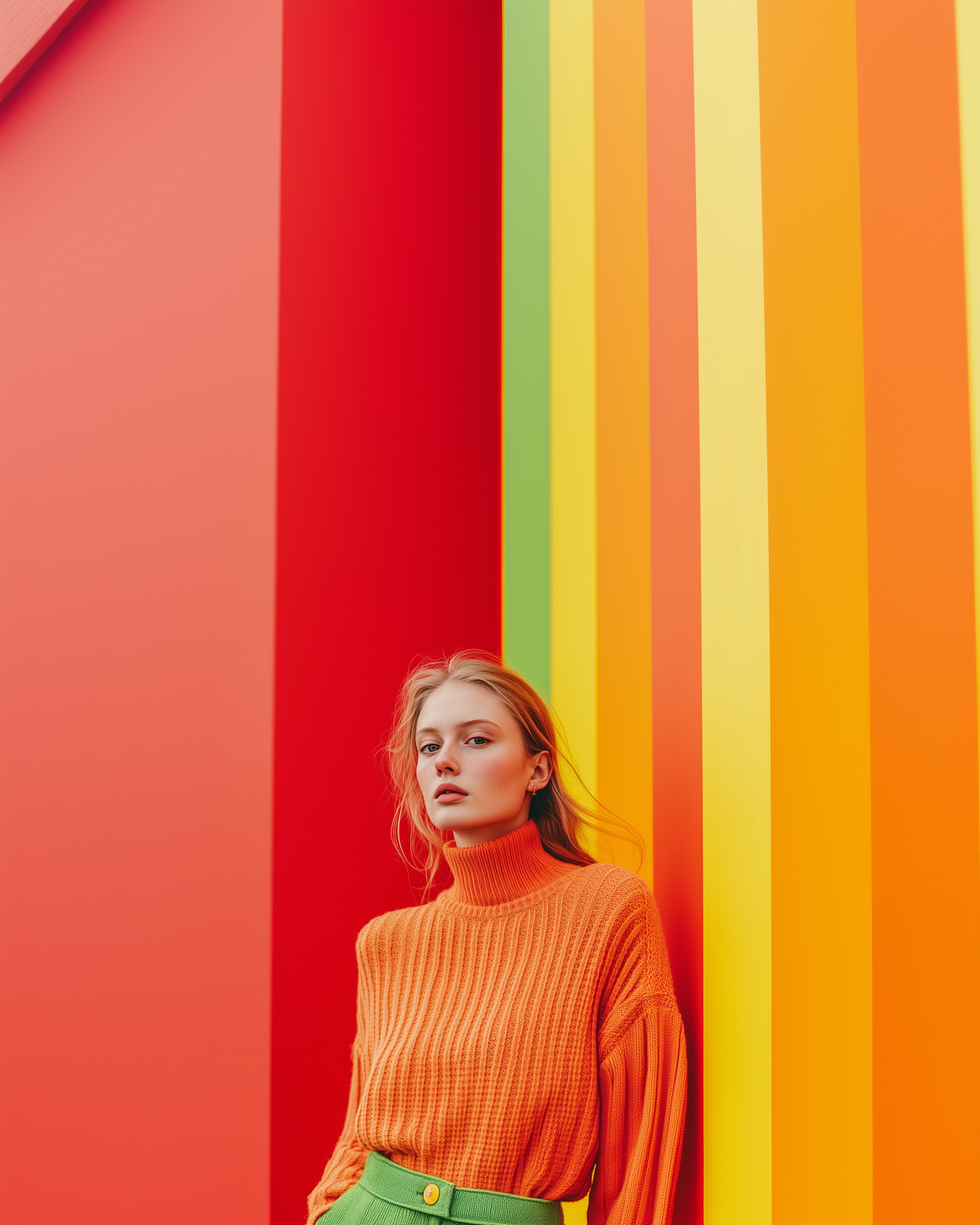 A woman in an orange sweater stands against a vibrant striped wall, featuring red, orange, yellow, and green colors.