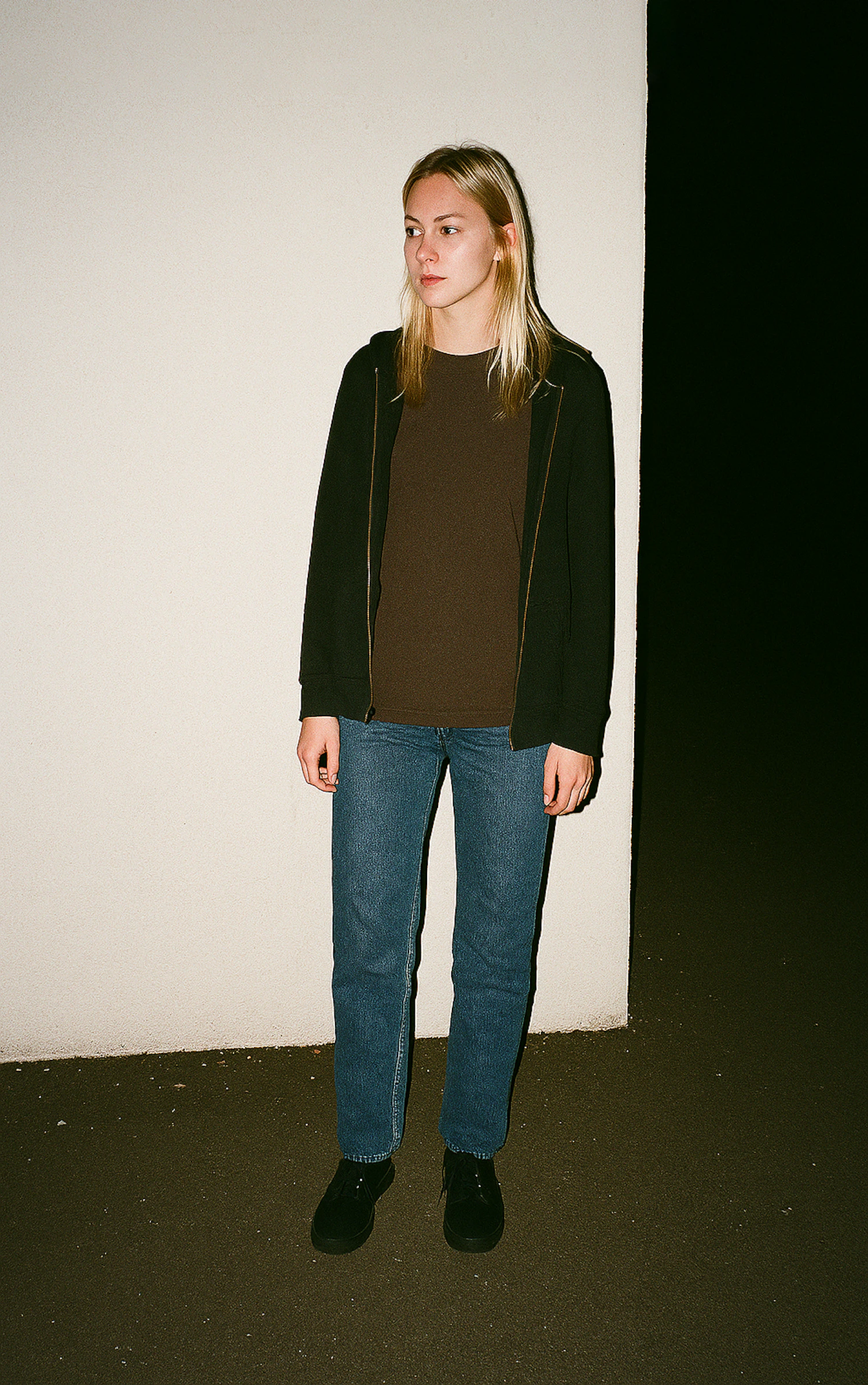 Casual portrait of a young woman in a black hoodie, brown shirt, and jeans, standing against a plain wall with a neutral expression.
