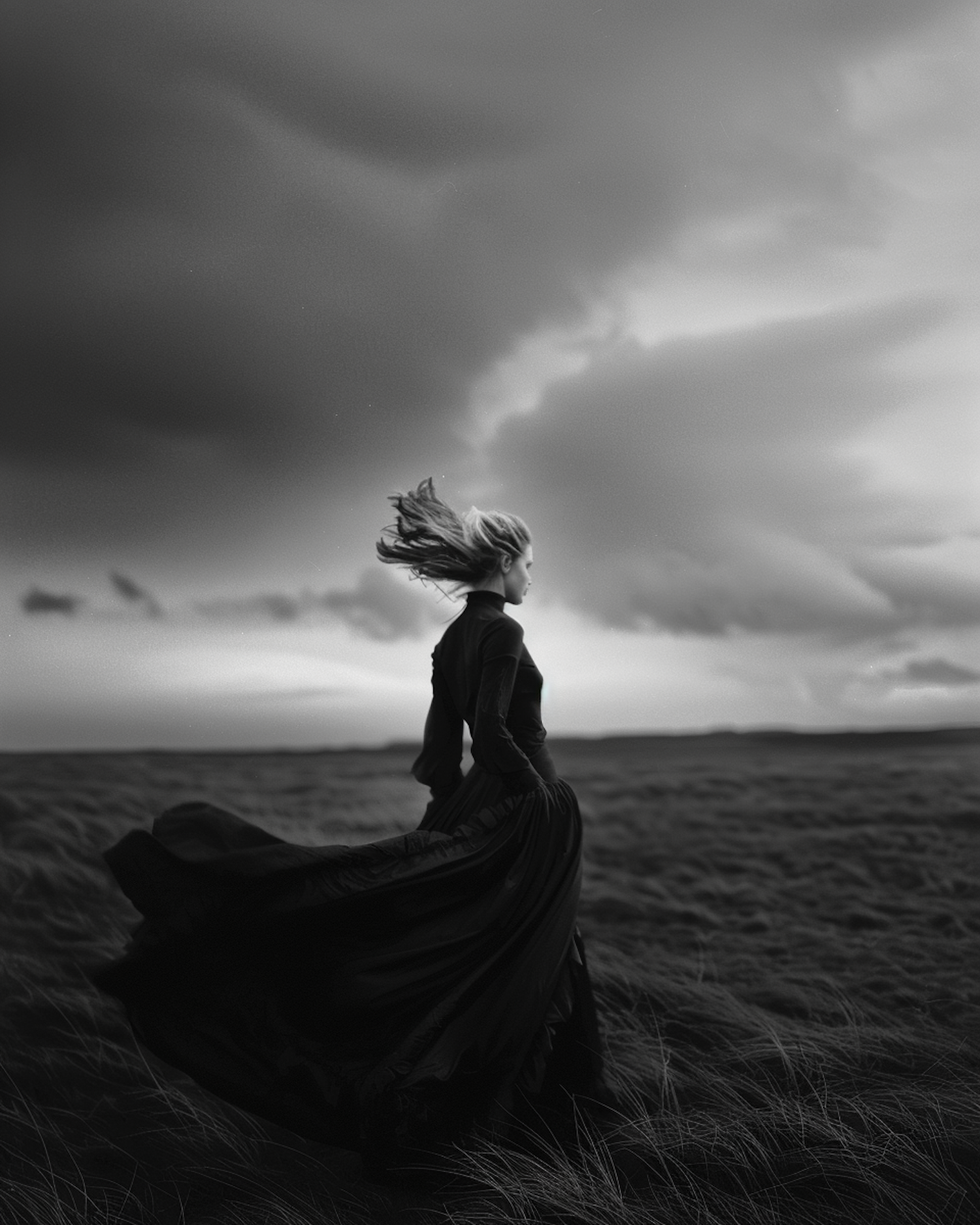 Black-and-white image of a woman in a windswept field, wearing a flowing dark dress under dramatic, stormy clouds.