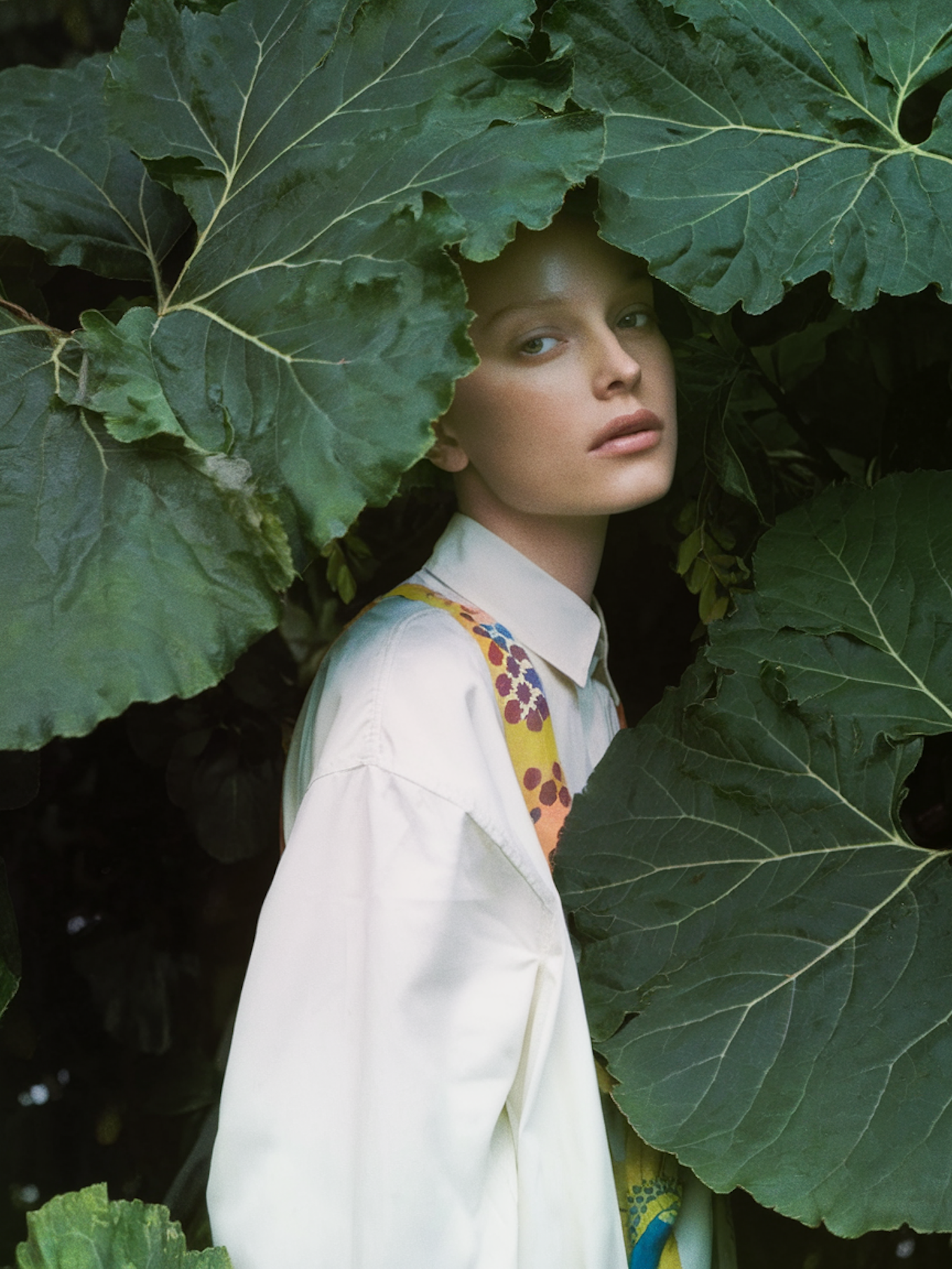 A serene portrait of a woman surrounded by large green leaves, wearing a white shirt with colorful suspenders. Nature-inspired elegance.