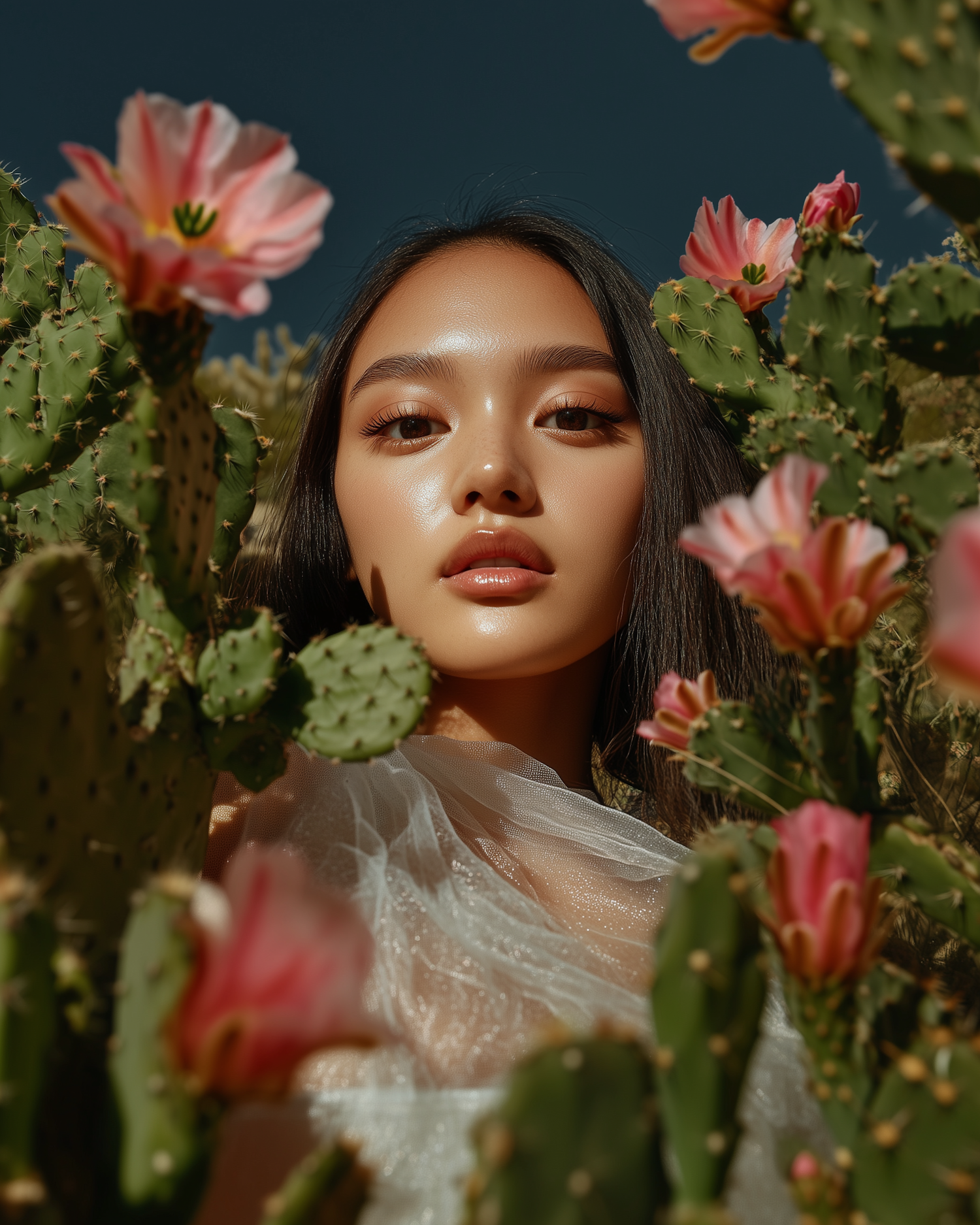 A serene portrait of a woman surrounded by blooming cacti under a deep blue sky, blending natural beauty with vibrant desert flora.