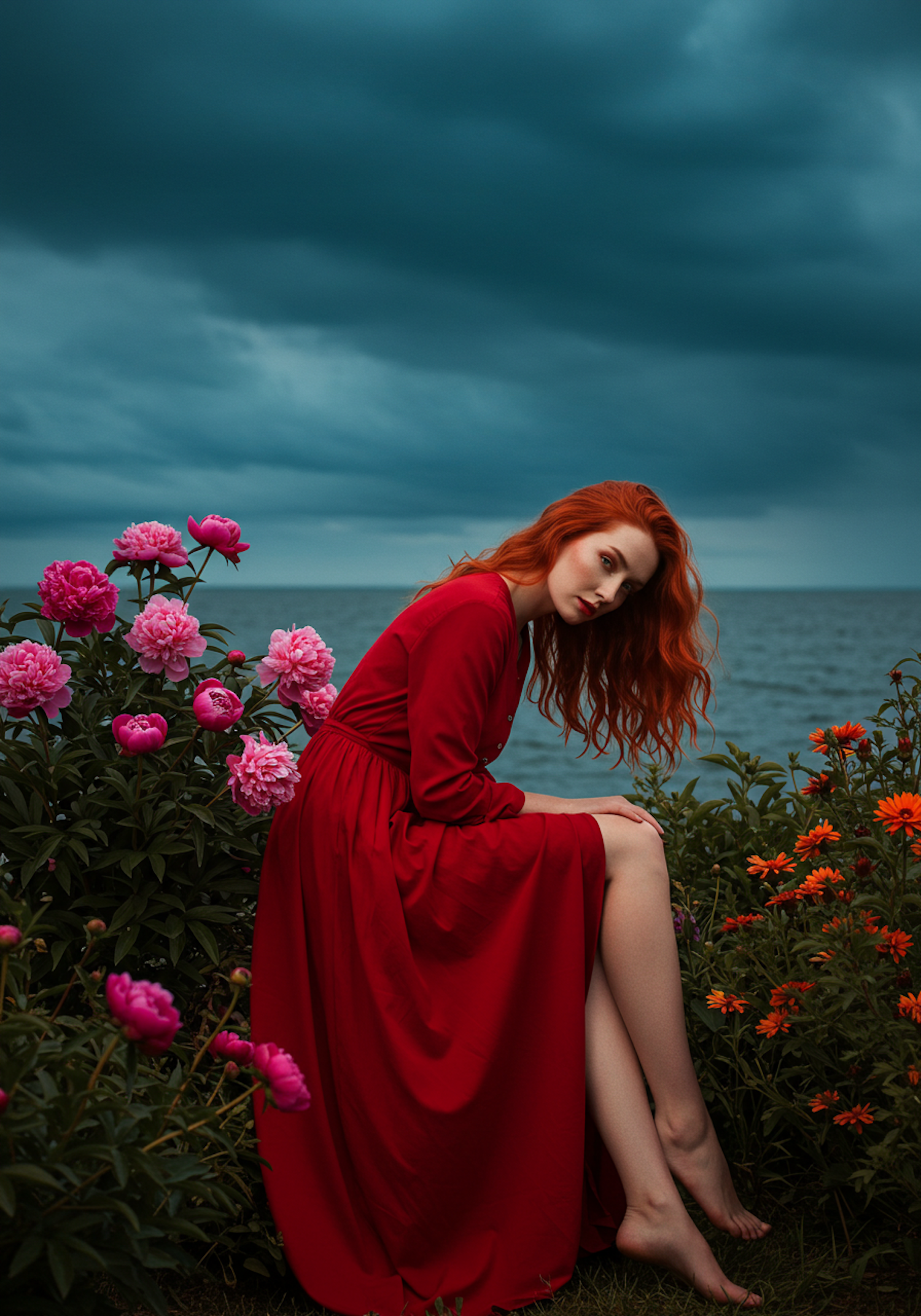 A serene portrait of a red-haired woman in a red dress, sitting among vibrant flowers by the ocean under a dramatic cloudy sky.