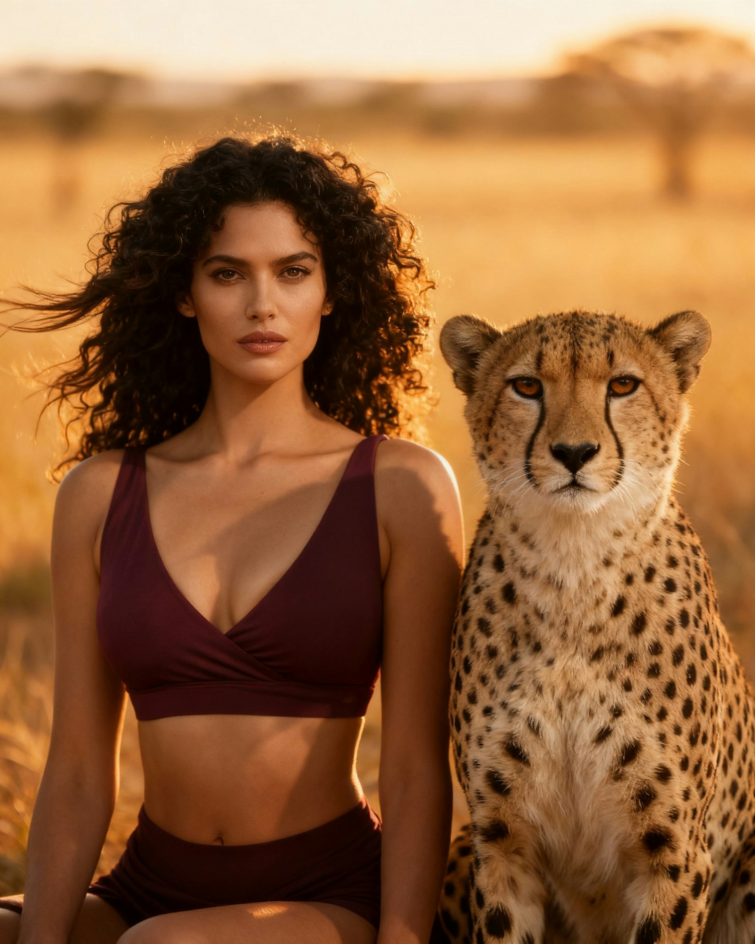 A woman in a burgundy outfit sits beside a cheetah in a golden savanna, both exuding calmness and harmony under warm sunlight.
