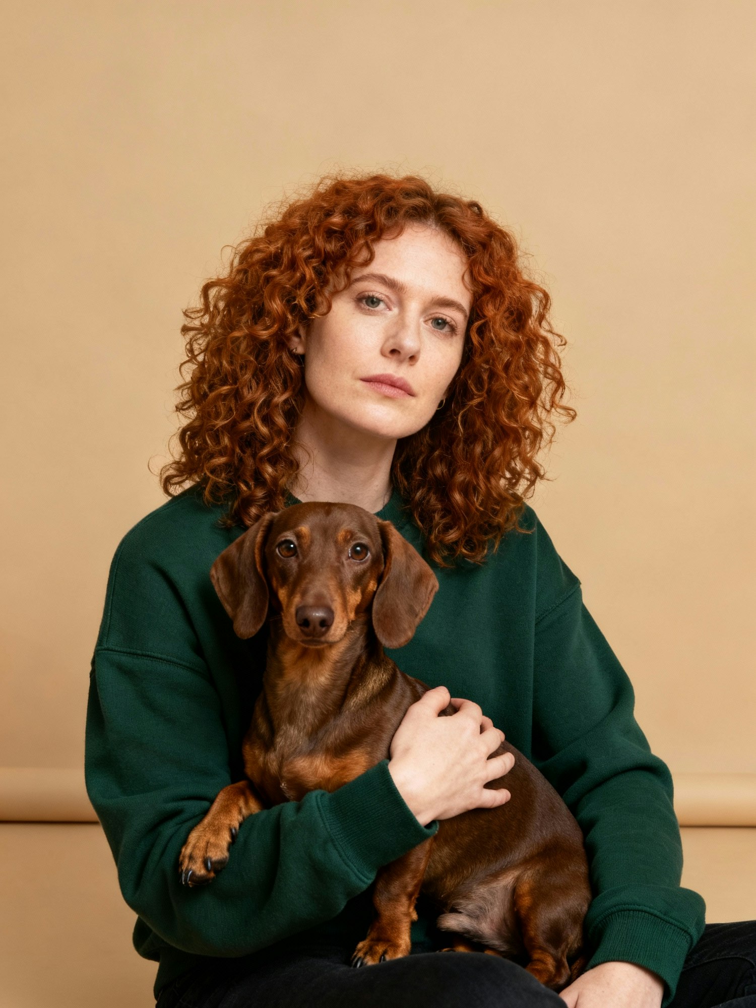 Studio portrait photography of a model with a dog. Soft beige background, perfectly uniform, no visible floor line, seamless. Flat diffused lighting, shadowless, evenly lit, natural skin tones, warm atmosphere. Composition intimate and minimal, both model and dog close to camera, sitting side by side or gently interacting. Calm expressions, natural styling, no exaggerated posing. Image sharp, high resolution, simple and authentic mood. A woman with curly auburn hair, wearing a dark green crewneck sweater, holds a dachshund close to her chest. The dog looks at the camera, while the woman’s expression stays calm and neutral.