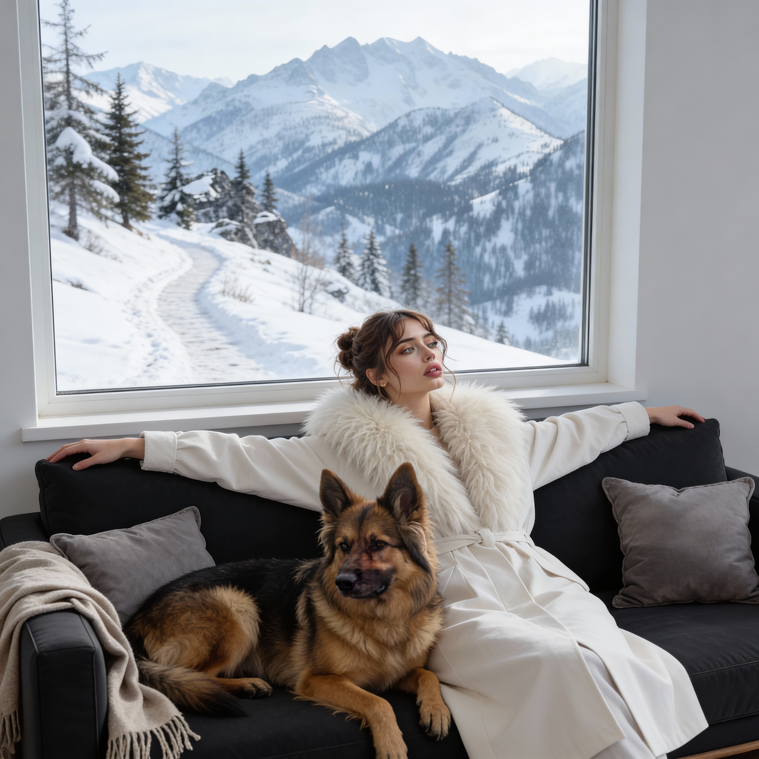 A woman in a white fur-collared coat sits with a German Shepherd on a sofa, with snowy mountains visible through a large window.