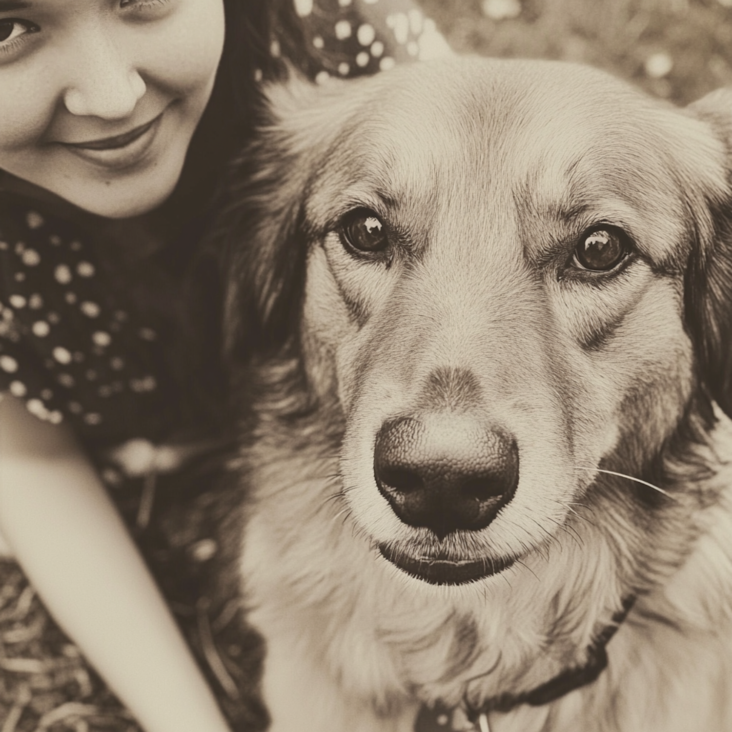Sepia-toned close-up of a smiling woman and her golden retriever, highlighting their bond and expressive eyes.