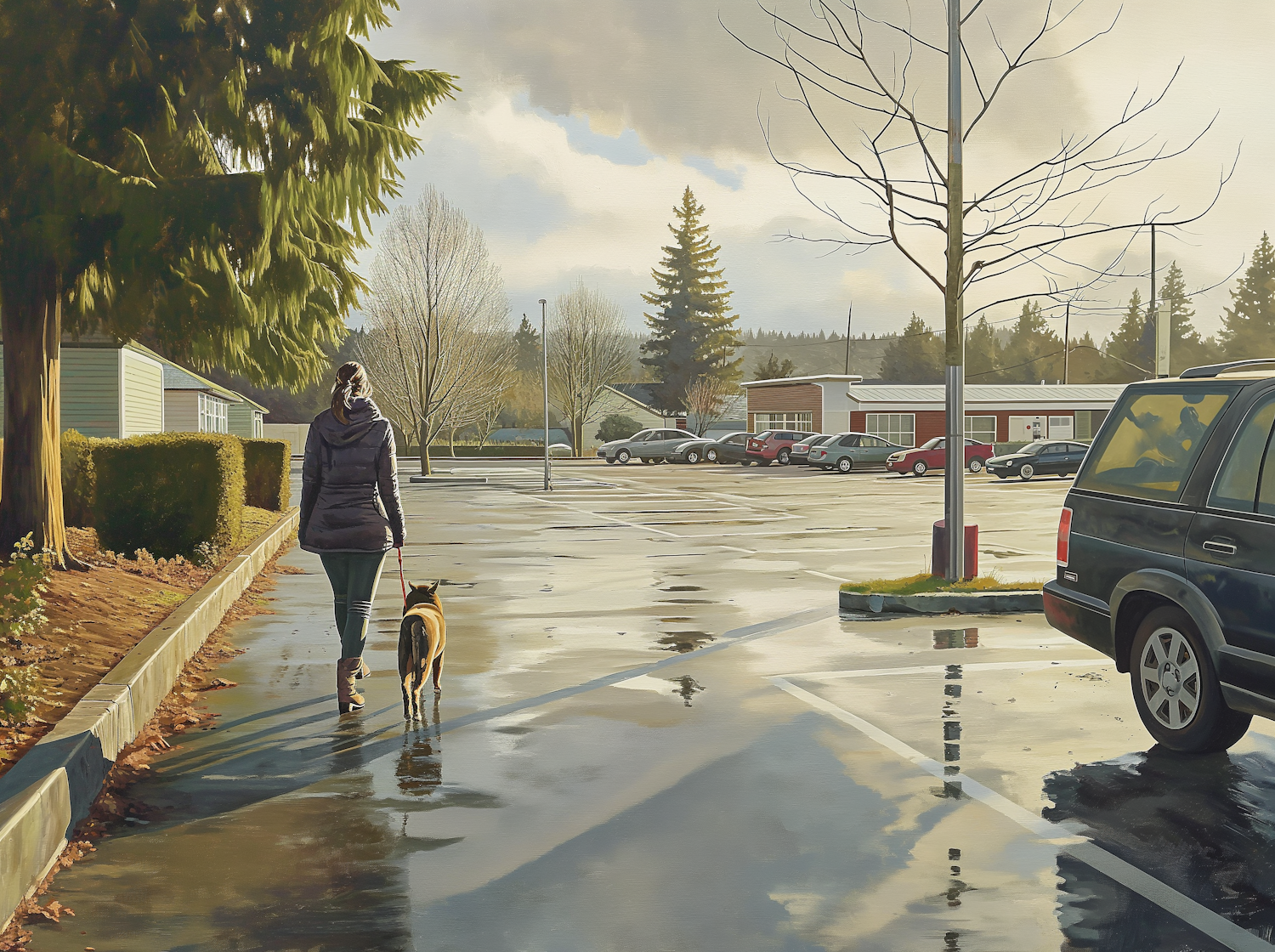 Woman walking a dog in a wet parking lot with reflections of clouds and trees, creating a serene post-rain atmosphere.