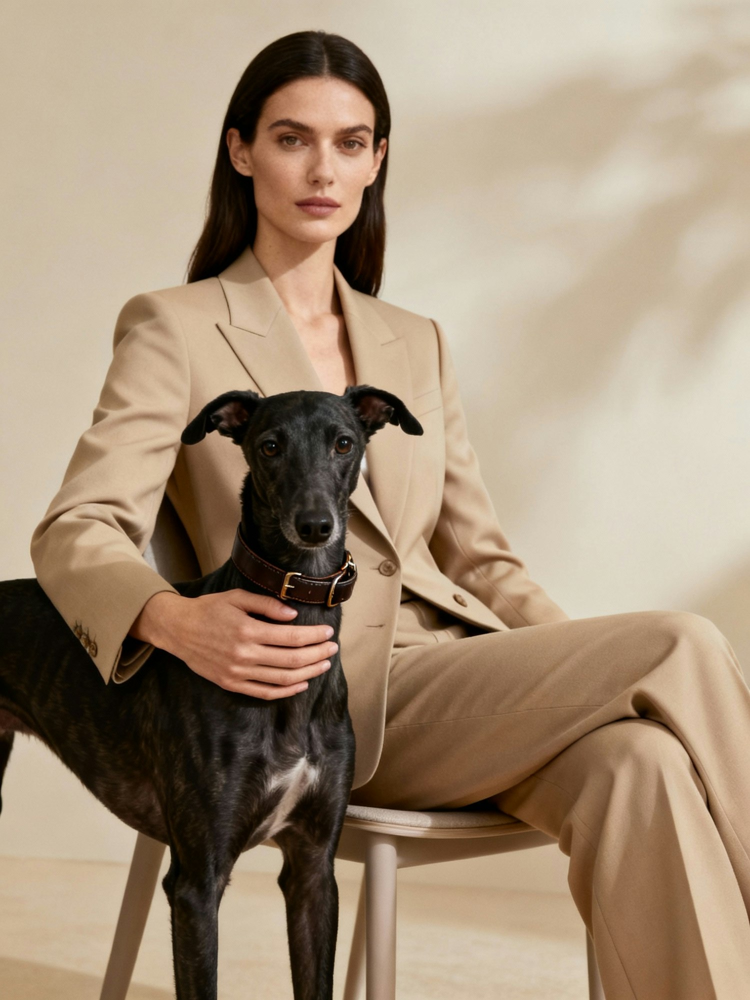 Editorial fashion photography of a model with a dog, shot in studio with soft neutral background, clean and minimal composition, sophisticated styling, soft diffused lighting, sharp focus, high-end magazine aesthetic. A tall brunette woman in a tailored beige suit sits elegantly on a chair, holding a sleek black greyhound with a leather collar, both looking straight at the camera