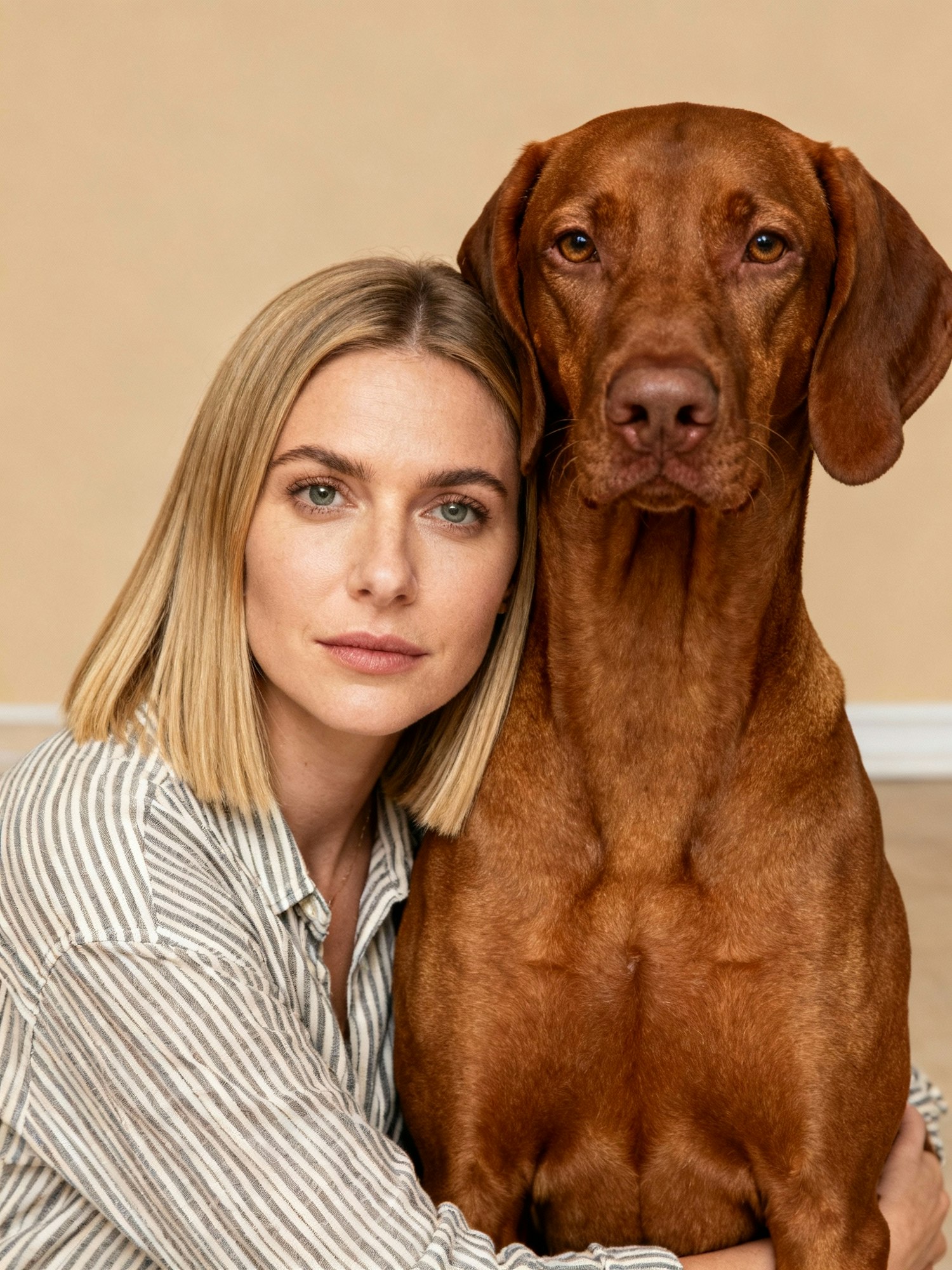 Studio portrait photography of a model with a dog. Soft beige background, perfectly uniform, seamless, no floor line. Flat diffused lighting, shadowless, evenly lit, natural skin tones, warm atmosphere. Minimal and intimate composition, both model and dog close to camera, side by side or gently interacting. Calm expressions, natural styling, no exaggerated posing. High resolution, sharp, simple and authentic mood. A woman with shoulder-length straight blonde hair, wearing a striped cotton shirt, hugs a large brown Vizsla dog close to her, their faces side by side in front of the lens