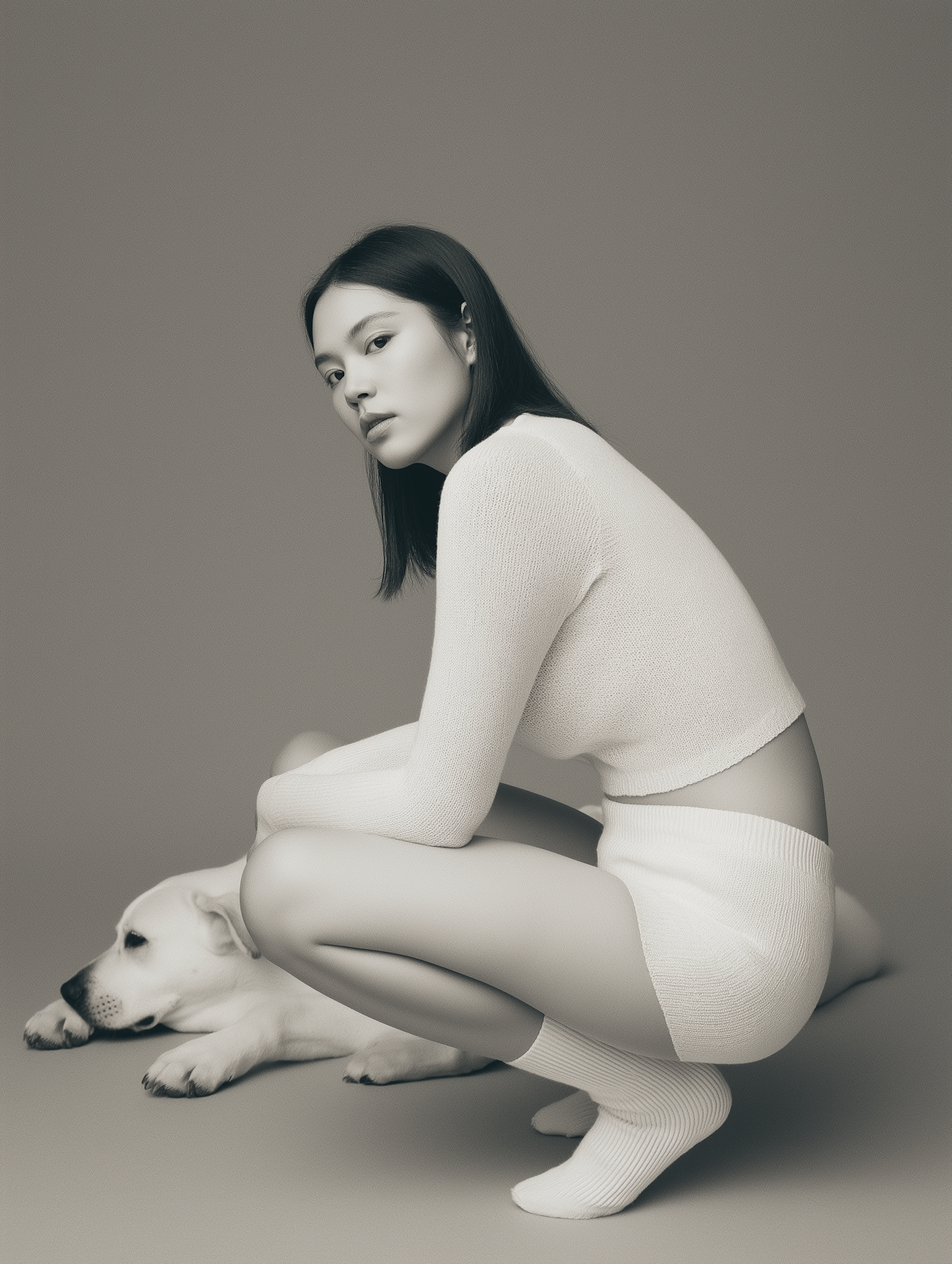 Minimalist monochromatic portrait of a woman crouching beside her relaxed dog, showcasing a calm and serene connection between the two.