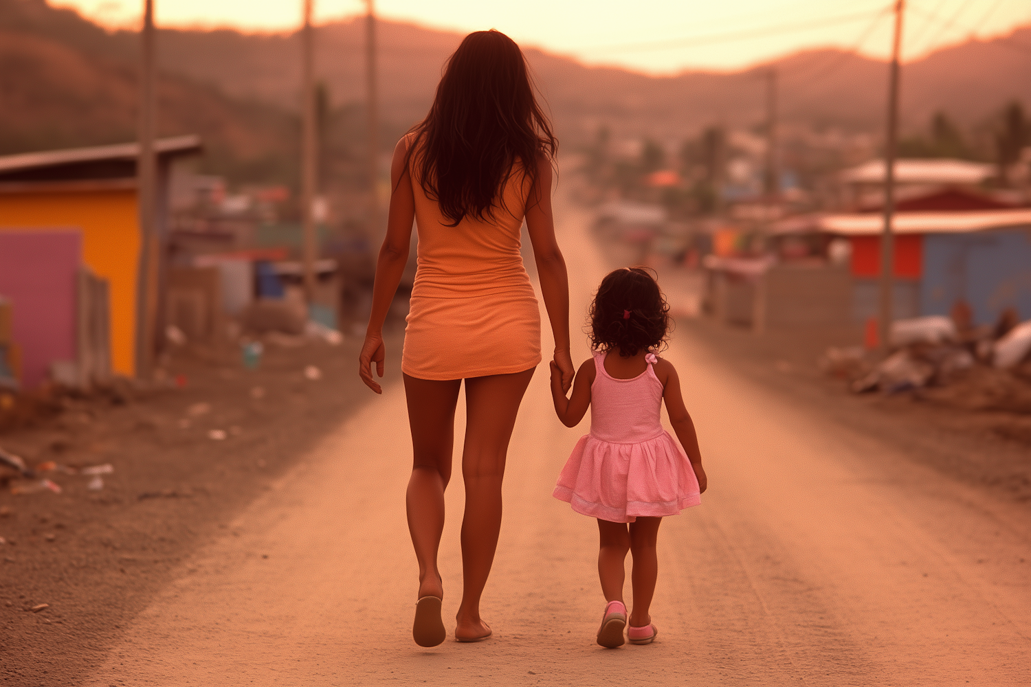 A woman and child walk hand in hand down a dusty road at sunset, surrounded by colorful buildings and a warm, golden glow.