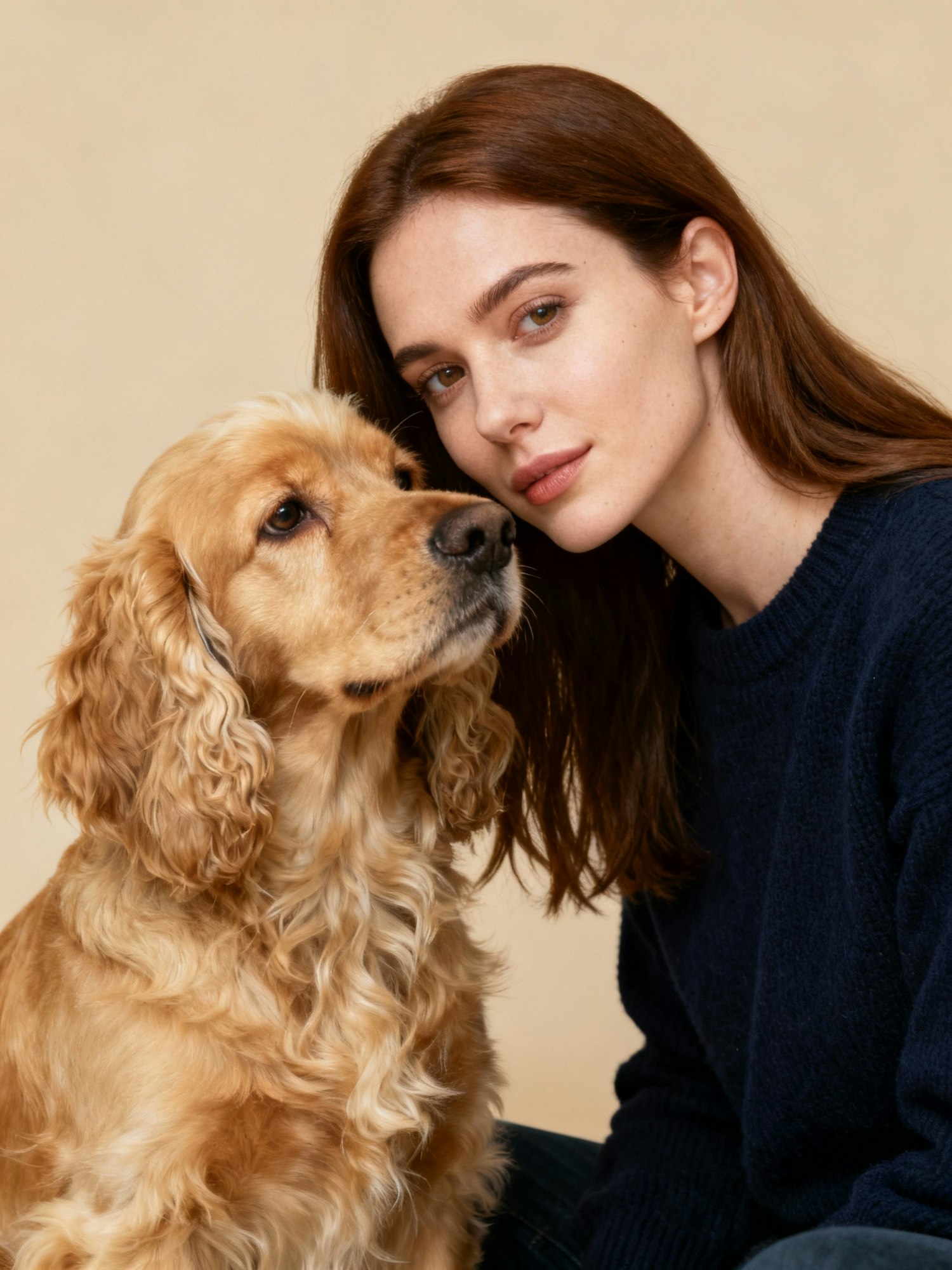 Studio portrait photography of a model with a dog. Soft beige background, perfectly uniform, seamless, no floor line. Flat diffused lighting, shadowless, evenly lit, natural skin tones, warm atmosphere. Minimal and intimate composition, both model and dog close to camera, side by side or gently interacting. Calm expressions, natural styling, no exaggerated posing. High resolution, sharp, simple and authentic mood. A woman with long chestnut hair, wearing a dark navy sweater, sits close to a fluffy golden cocker spaniel, both gazing softly into the lens, their faces aligned