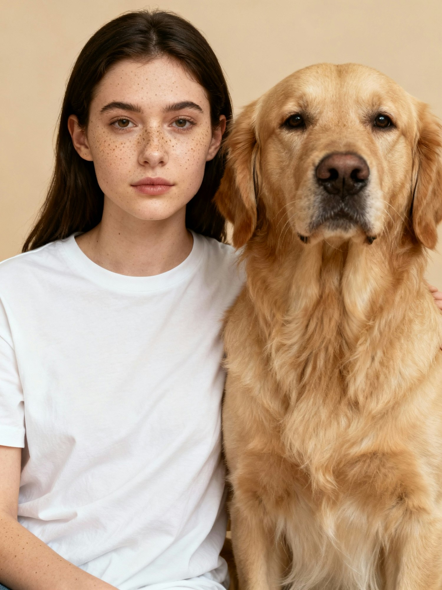 Studio portrait photography of a model with a dog. Soft beige background, perfectly uniform, no visible floor line, seamless. Flat diffused lighting, shadowless, evenly lit, natural skin tones, warm atmosphere. Composition intimate and minimal, both model and dog close to camera, sitting side by side or gently interacting. Calm expressions, natural styling, no exaggerated posing. Image sharp, high resolution, simple and authentic mood. A young brunette woman with freckles, wearing a plain white cotton shirt, sits close to a golden retriever. Both face the camera with relaxed expressions, their shoulders gently touching.