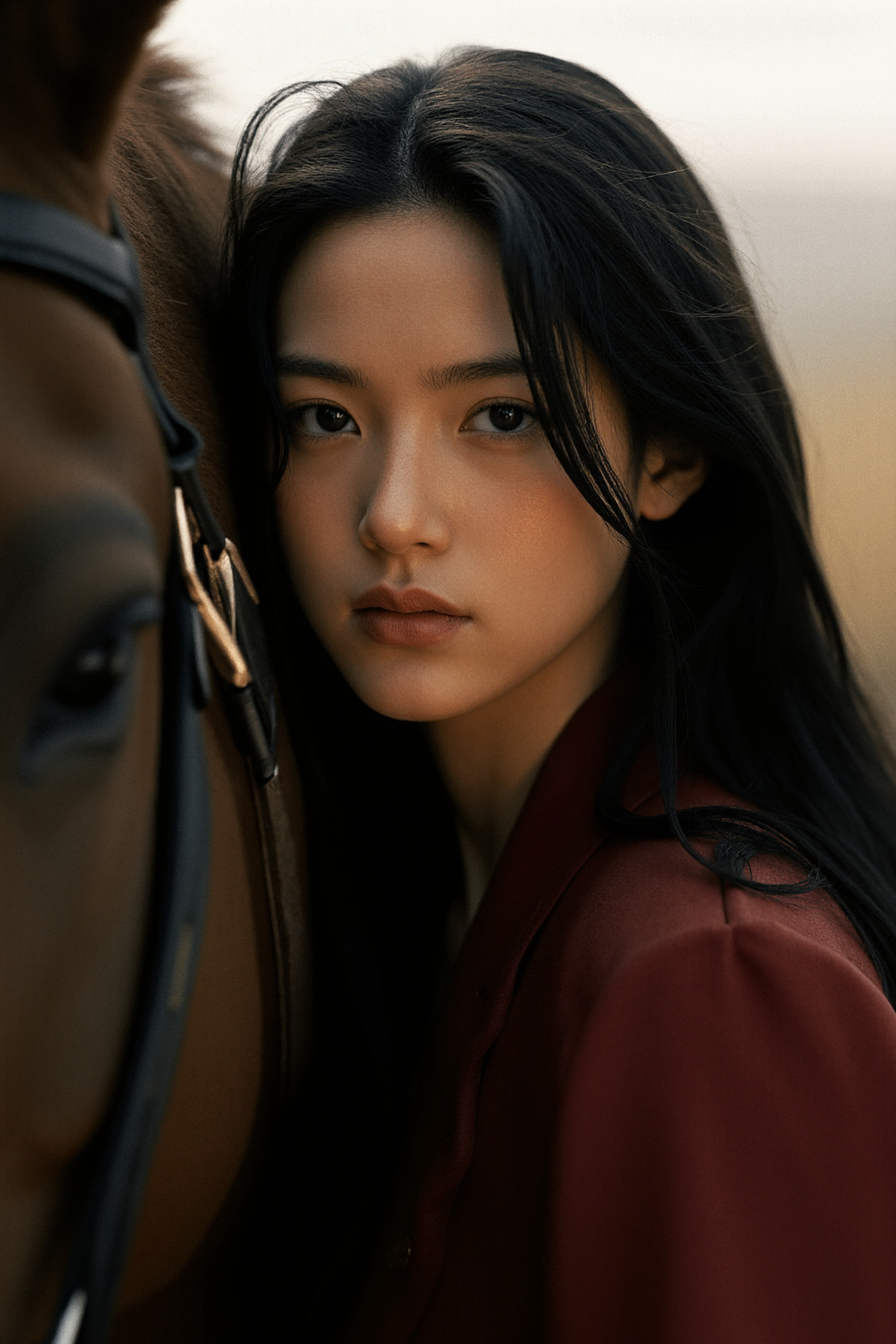 Asian woman with long black hair and a brown horse, wearing a red garment. Calm expression, intimate connection, soft background.