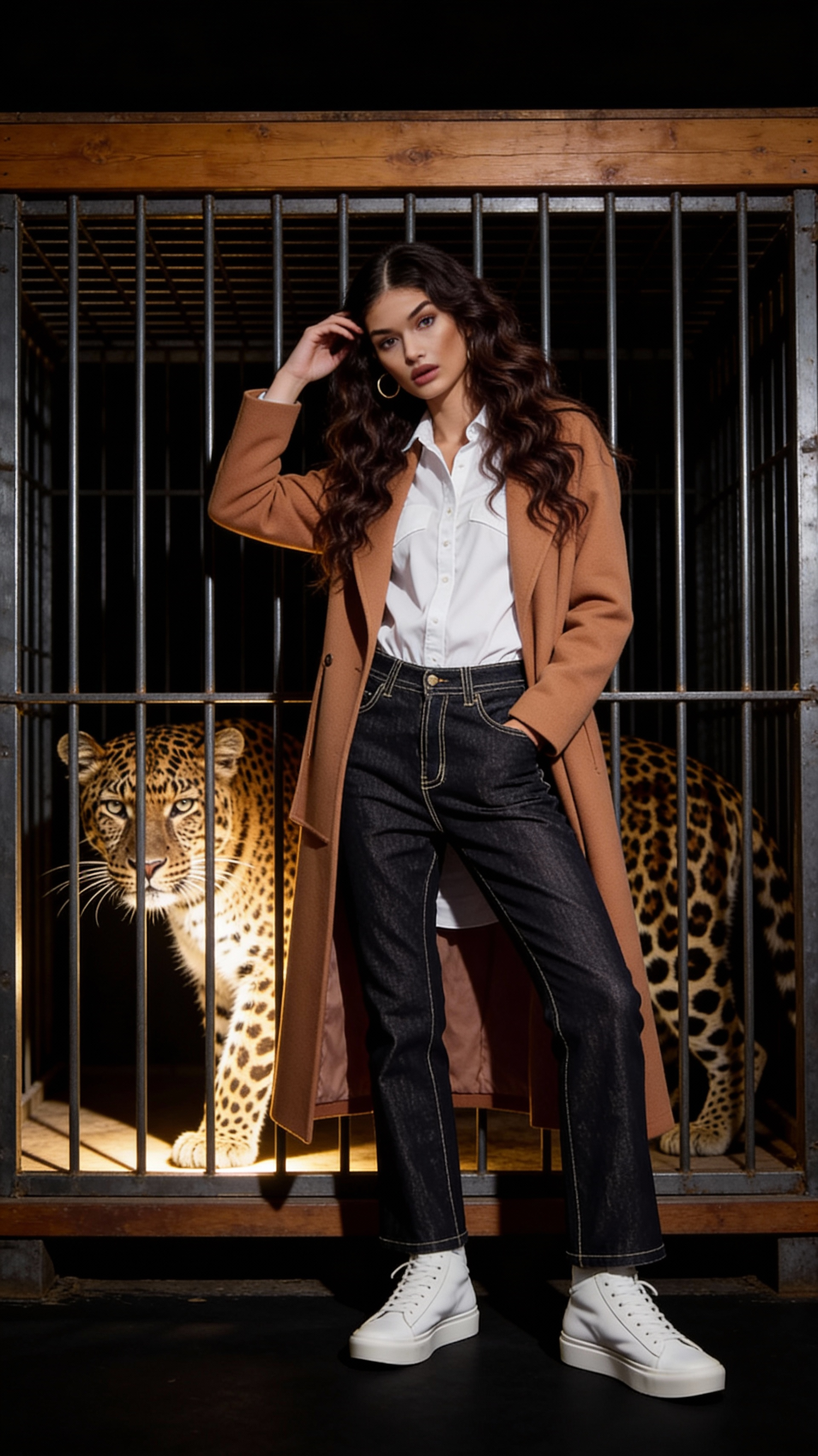A stylish woman poses confidently in front of a leopard in a cage, wearing a camel coat, white shirt, and dark jeans with white sneakers.