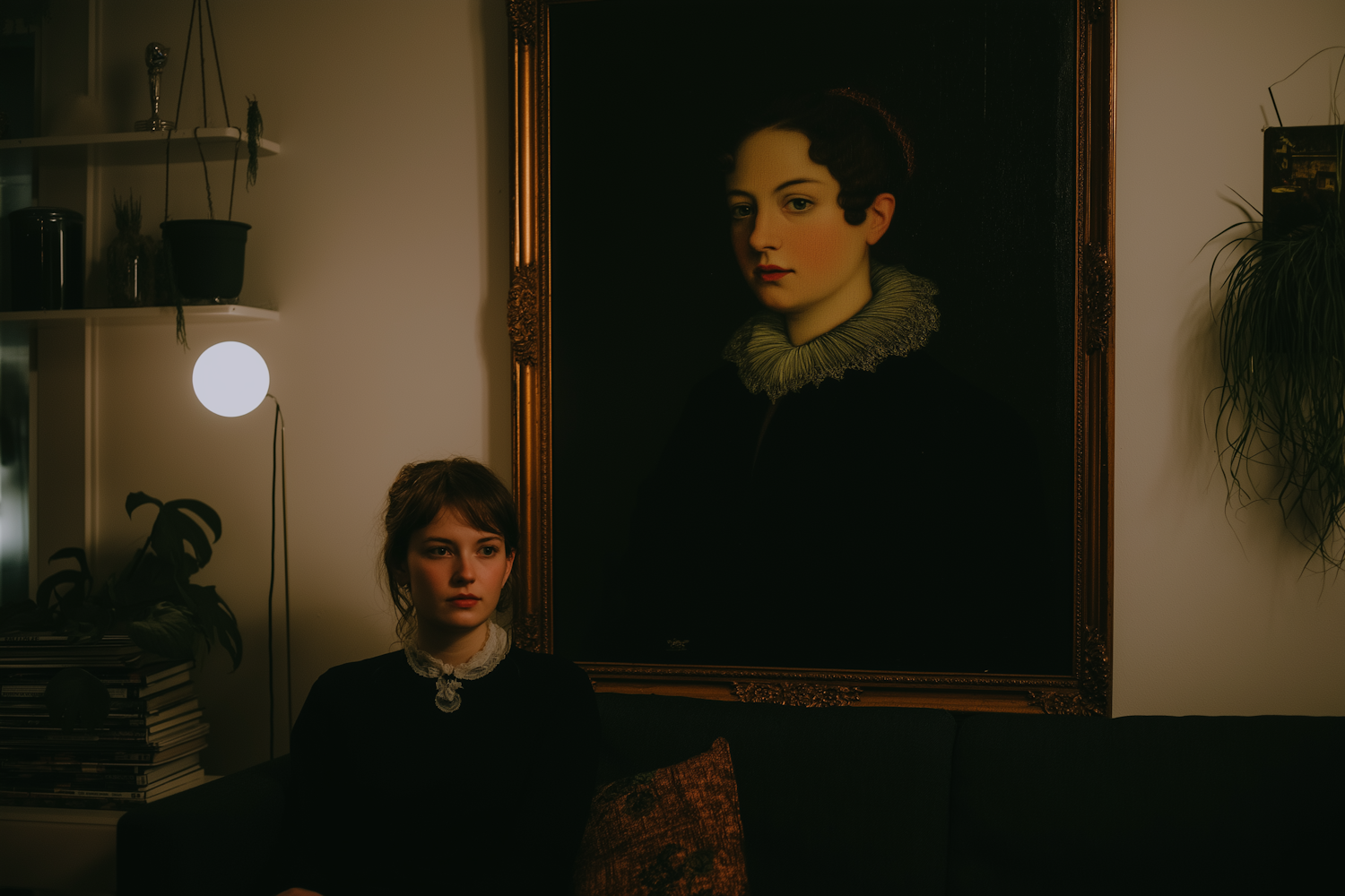 A young woman sits beside a classical portrait in a dimly lit, cozy room with plants and a glowing lamp, creating a serene atmosphere.