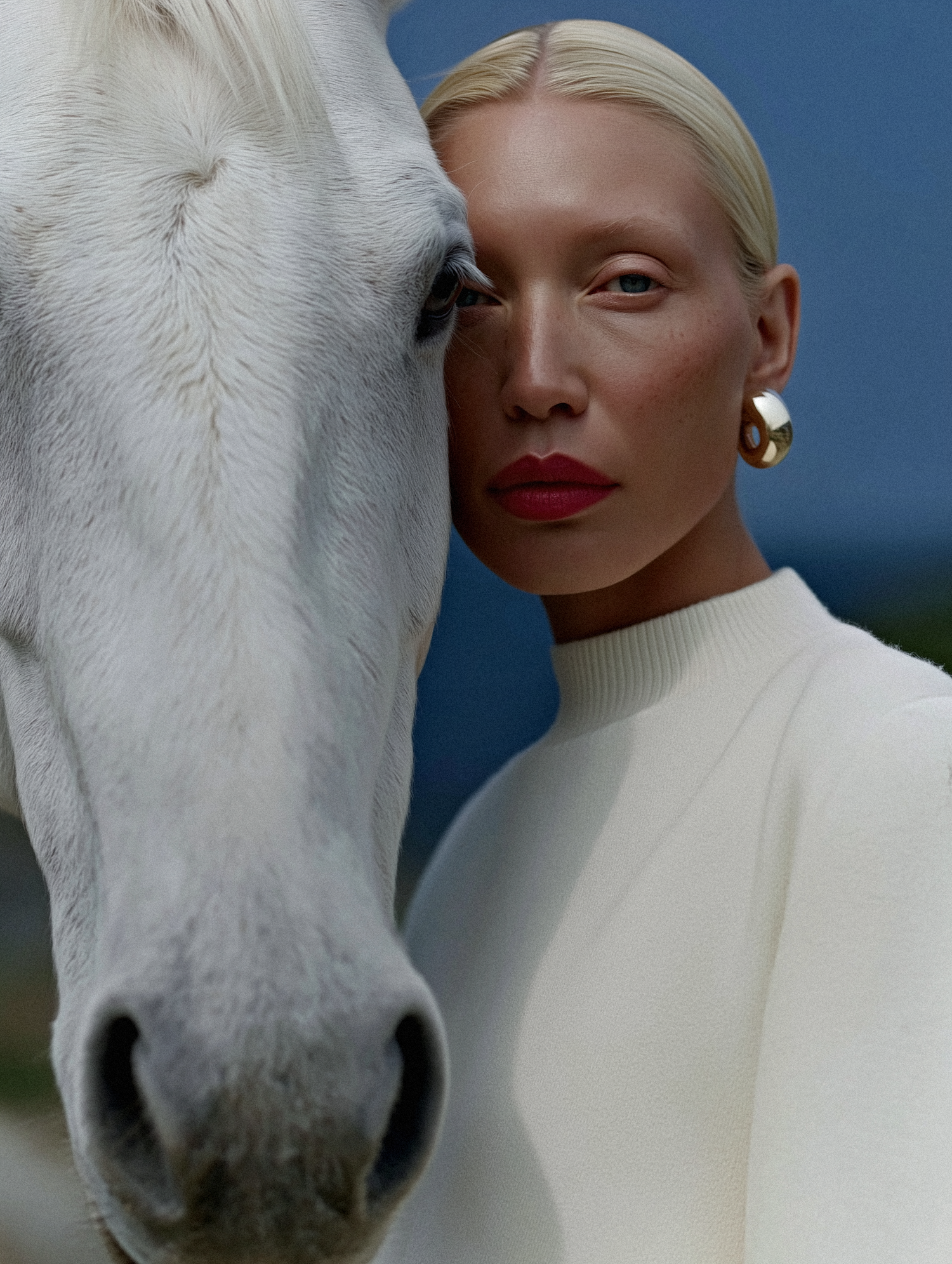 A serene portrait of a woman and a white horse, their faces aligned, set against a muted blue background, showcasing elegance and connection.