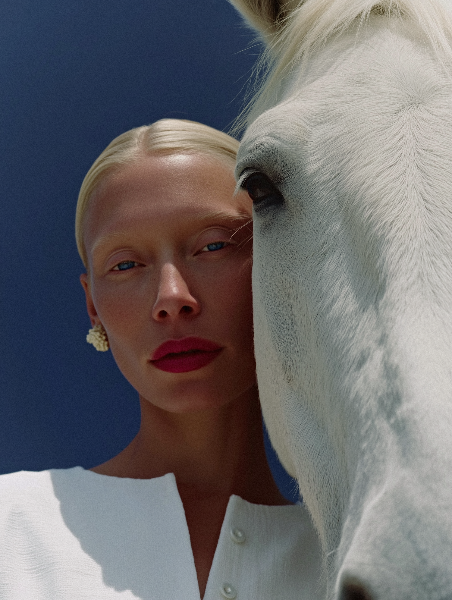 A striking portrait of a woman and a white horse against a deep blue sky, showcasing elegance and harmony in a minimalist composition.
