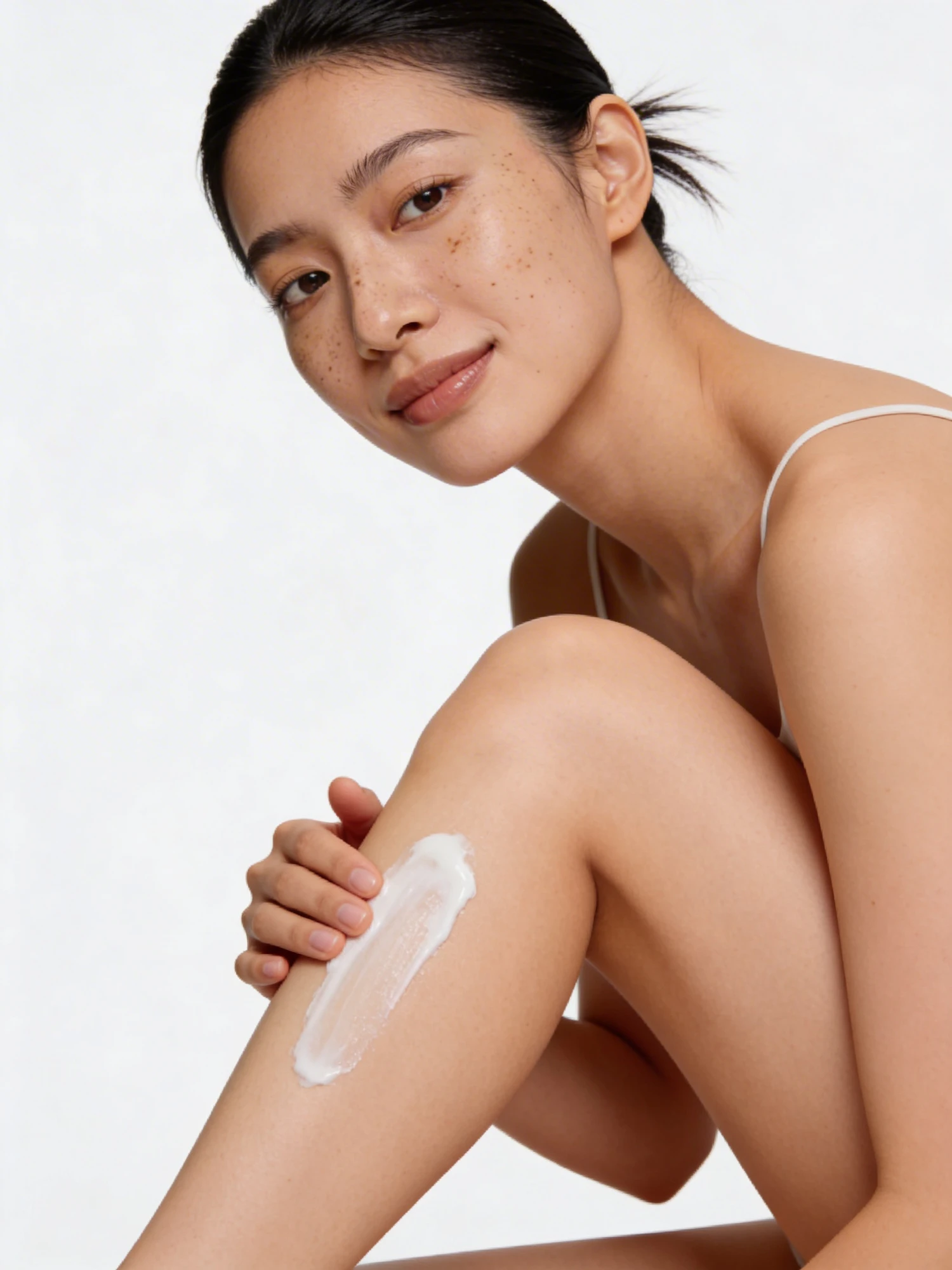 A woman with freckles applies cream to her leg, showcasing skincare in a clean and minimalistic setting.
