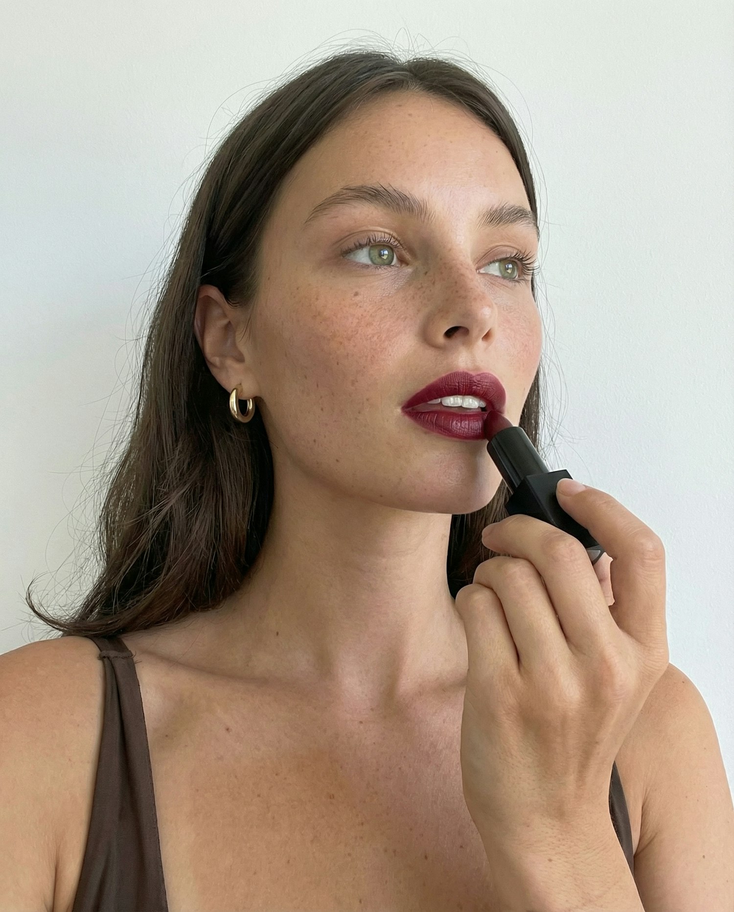 A woman with green eyes and dark hair applies deep red lipstick, wearing gold hoop earrings and a brown top against a white background.