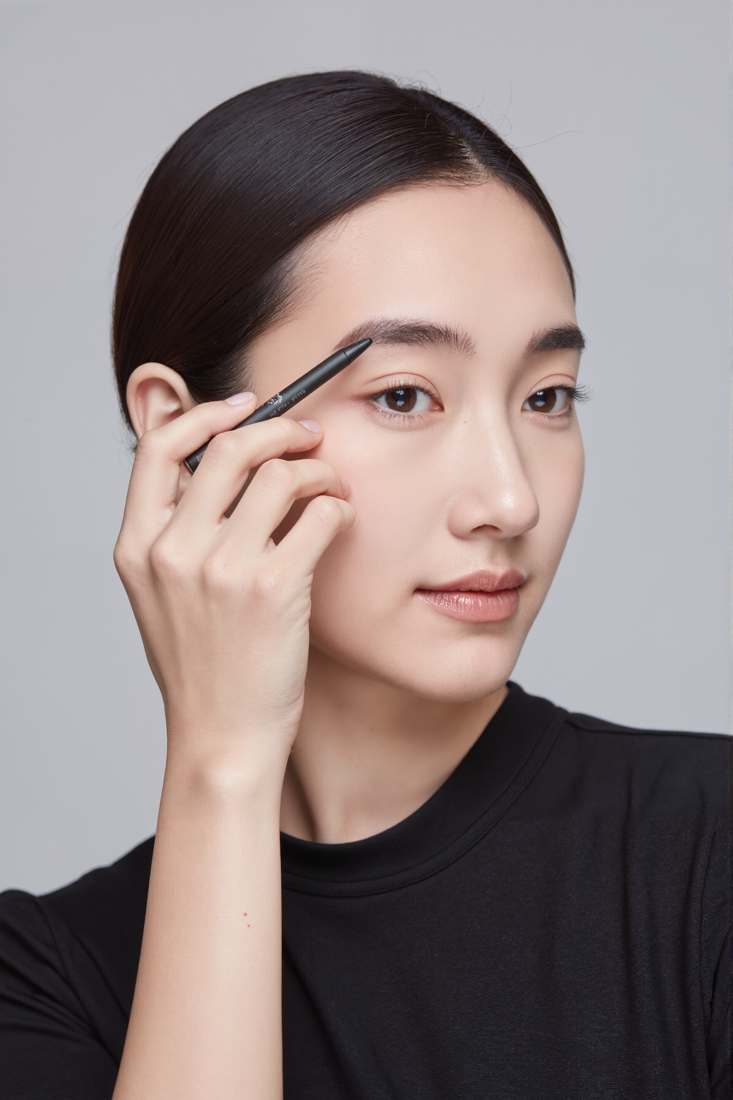 A woman with sleek hair applies eyebrow makeup with a pencil, showcasing a natural beauty routine against a neutral gray background.