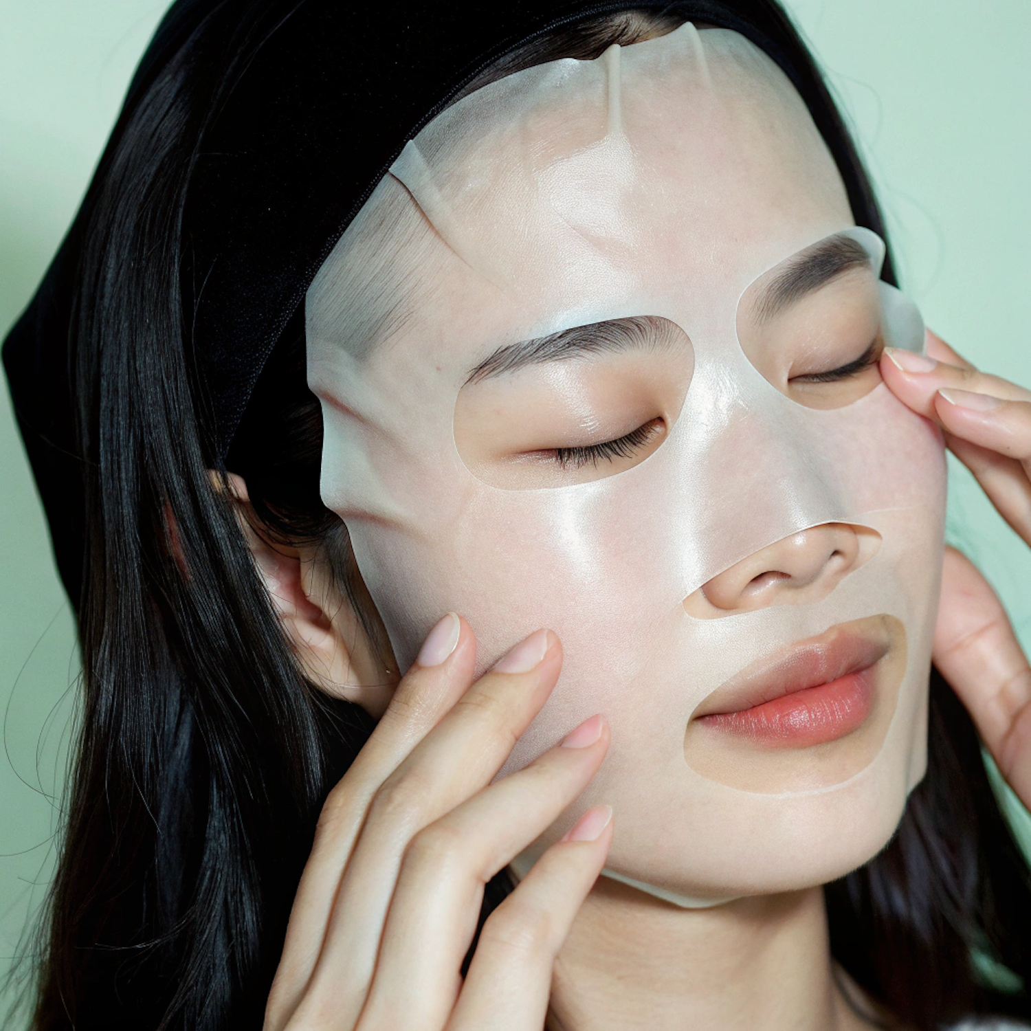 Close-up of a woman applying a hydrating sheet mask, with a calm expression and a soft green background for a relaxing skincare vibe.