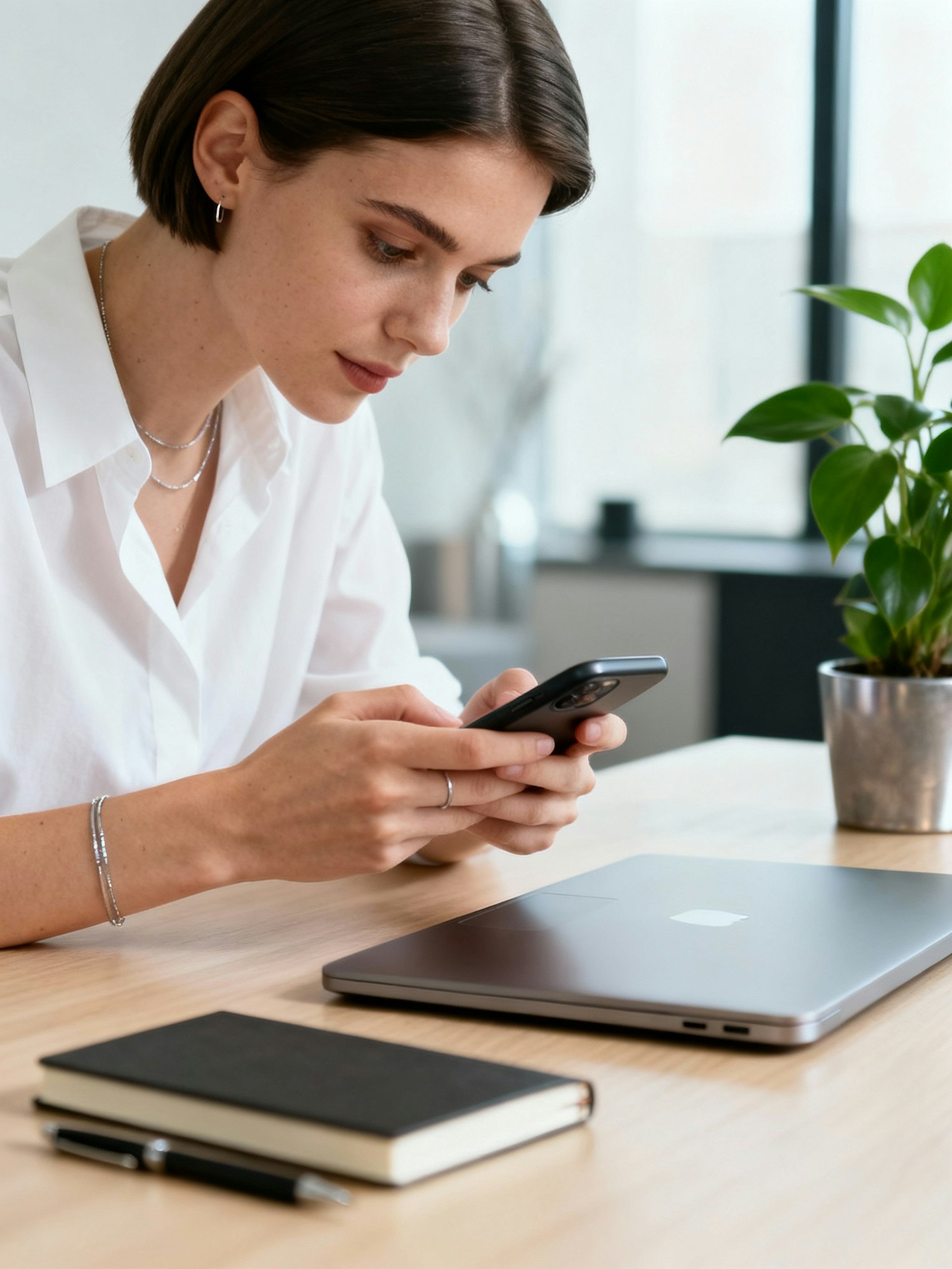 A woman in a white shirt uses her smartphone at a desk with a laptop, notebook, and plant, creating a modern and focused workspace vibe.
