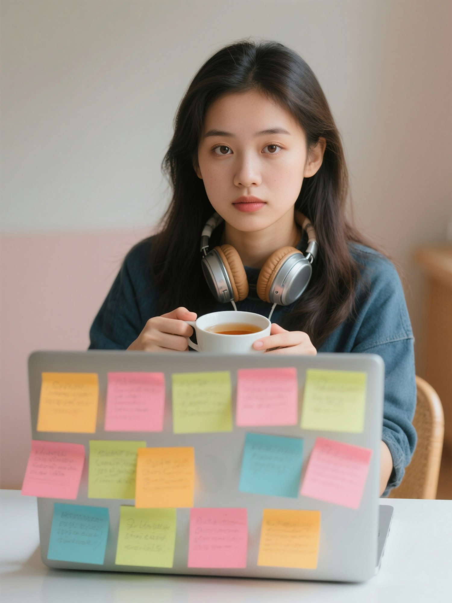 editorial-style indoor photography, soft natural light, pastel tones, candid Gen Z aesthetic, bright minimal background, warm vintage-inspired color grading, shallow depth of field, shot on a high-quality DSLR girl in front of a laptop with 10 sticky notes on the screen, holding a cup of tea with both hands and staring blankly at the camera, burnout-core but cute, vintage headphones around her neck