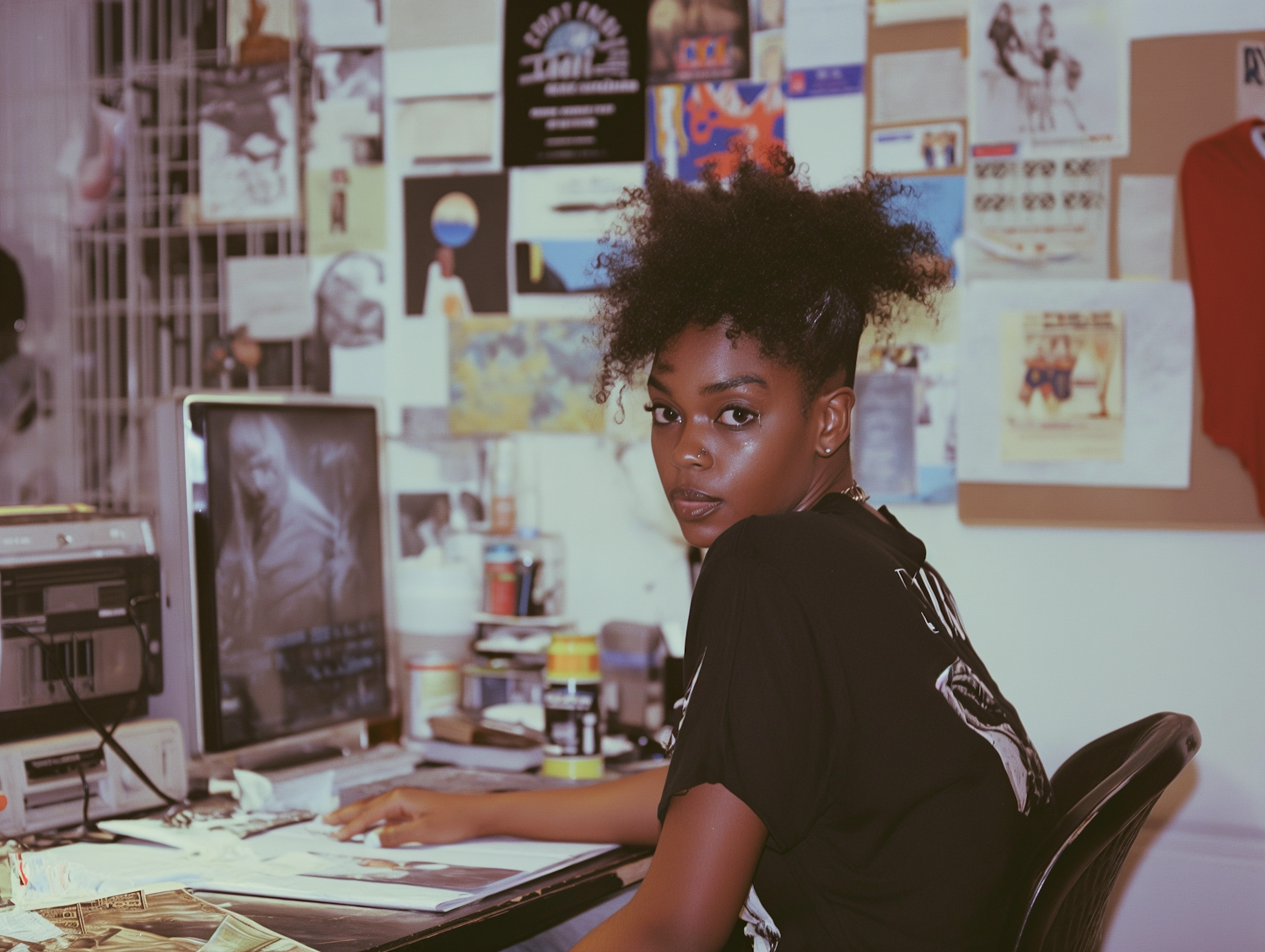 Young woman with natural hair at a creative desk, surrounded by art supplies and a collage of posters on the wall.
