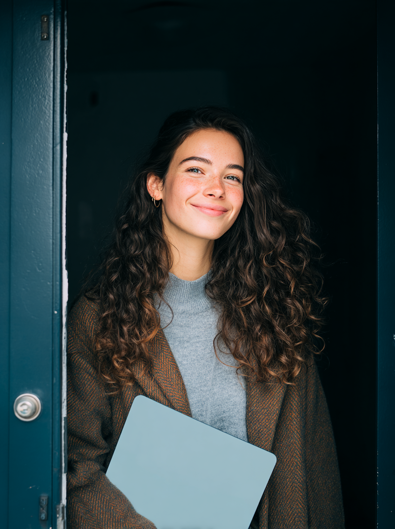 A young woman with curly hair in a cozy coat holds a tablet, smiling warmly at a doorway.
