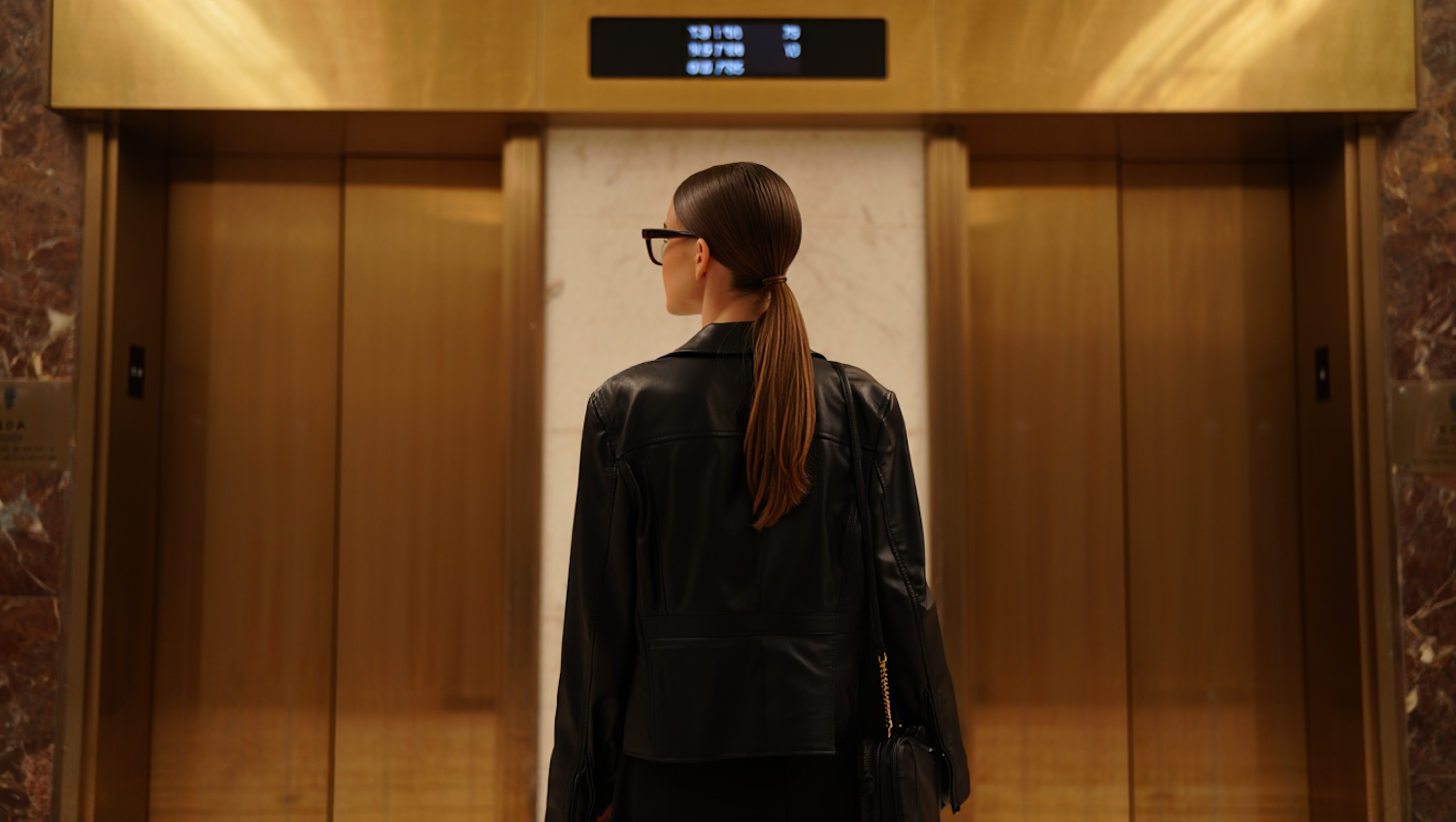 A stylish woman in a black leather jacket waits at golden elevators in a luxurious, marble-accented lobby.