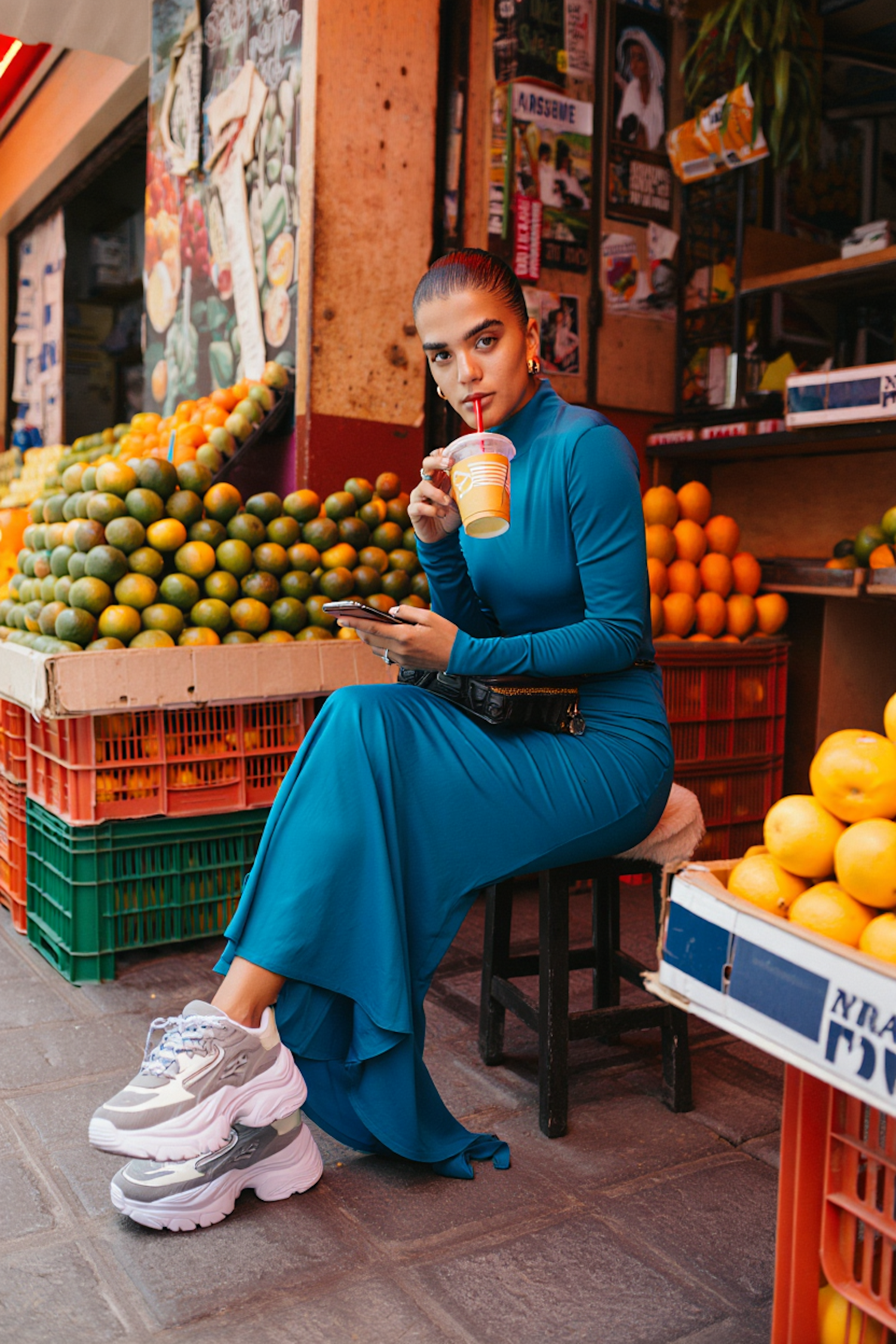 Stylish woman in teal dress and sneakers enjoys a drink at a vibrant fruit market surrounded by colorful oranges and limes.