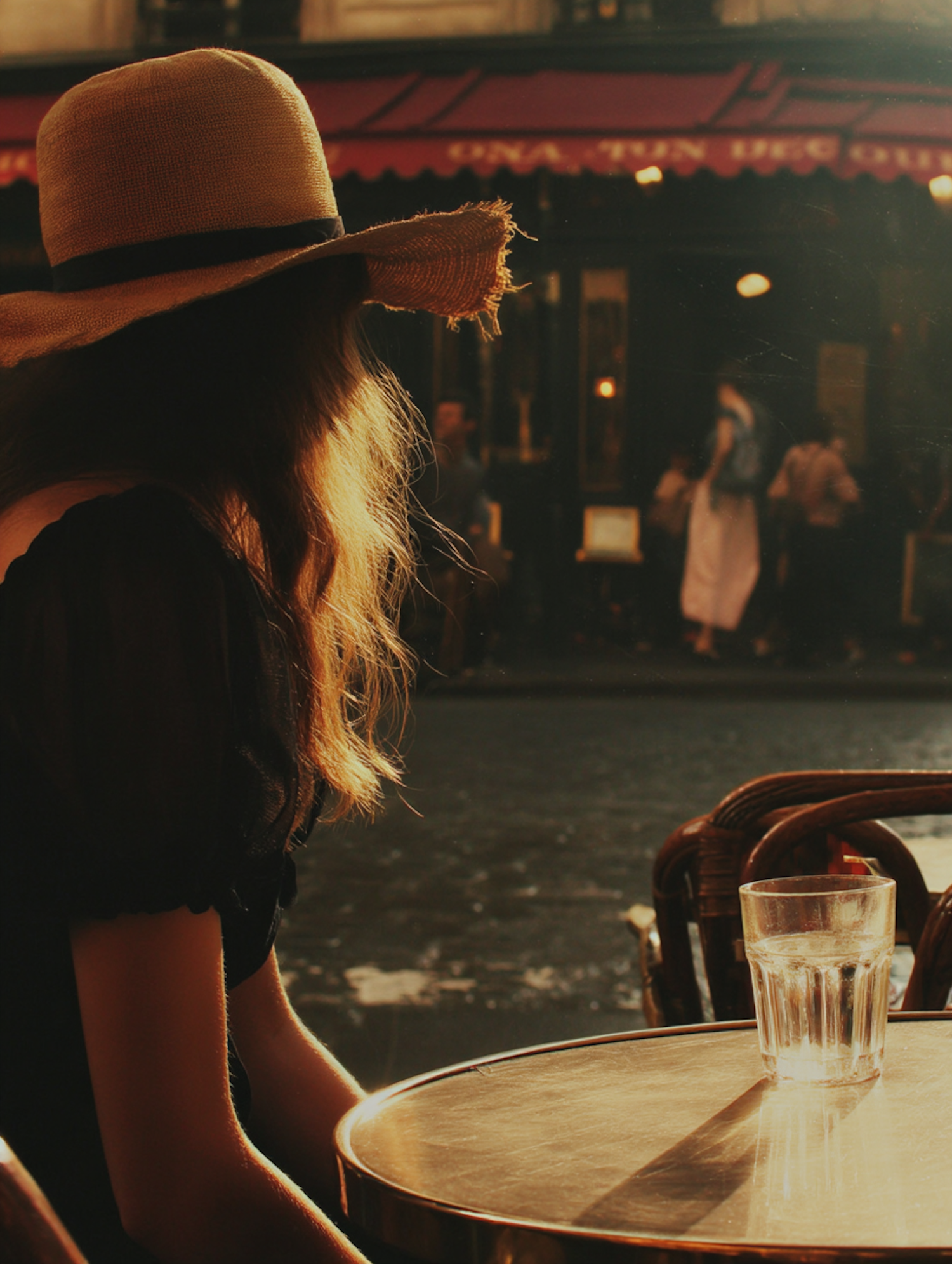A woman in a straw hat sits at a café table in golden sunlight, with a glass of water and a Parisian street scene in the background.